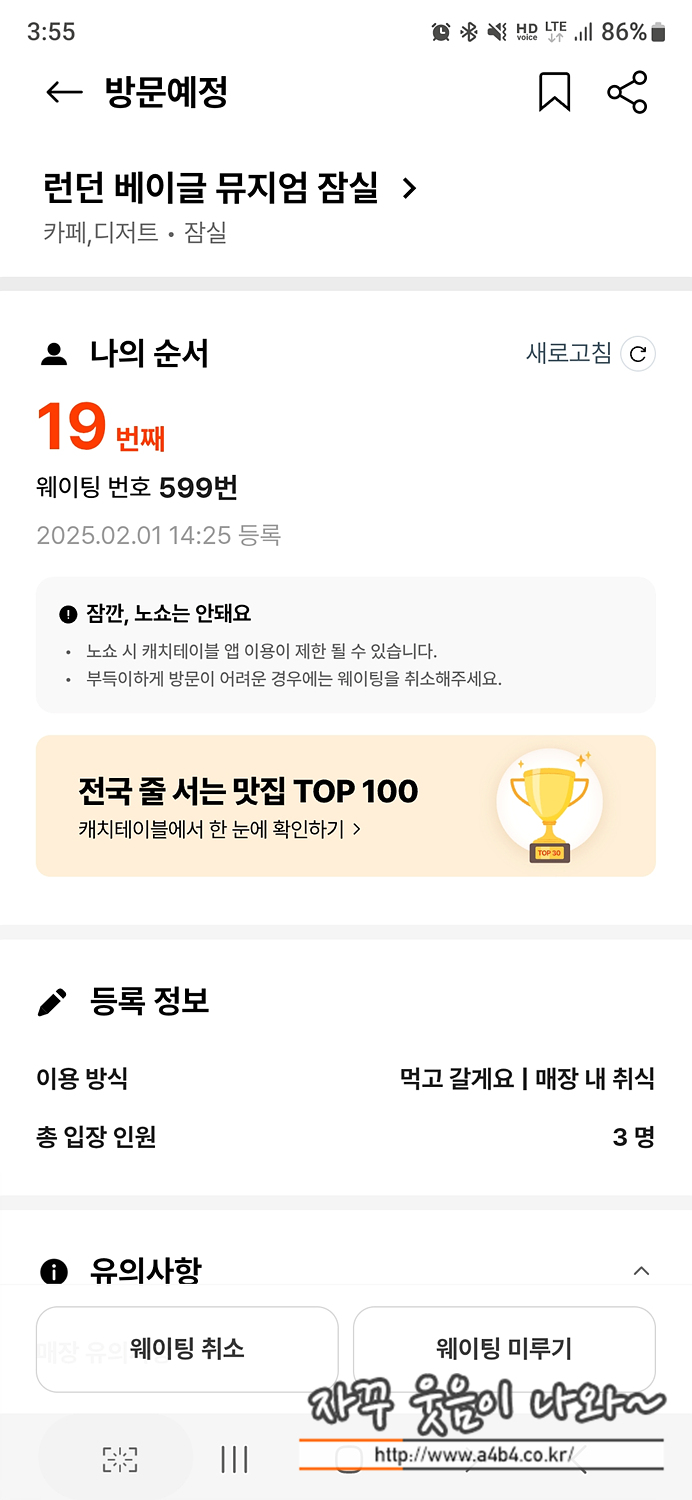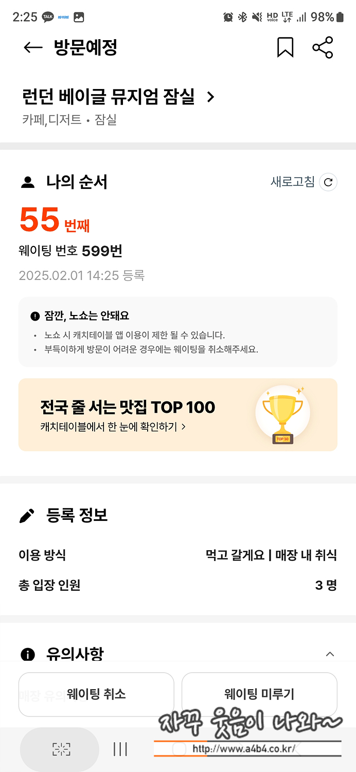 14:25 분에 예약했고 55번 째 대기자로 등록되었습니다. 30분 사이에 14팀 빠졌네요.
