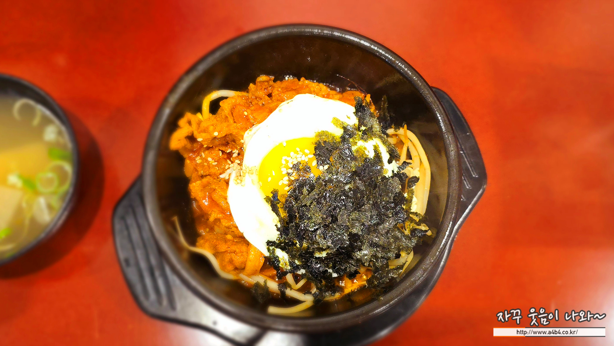 뚝배기 위에 제육볶음밥 계란후라이가 보이고요.