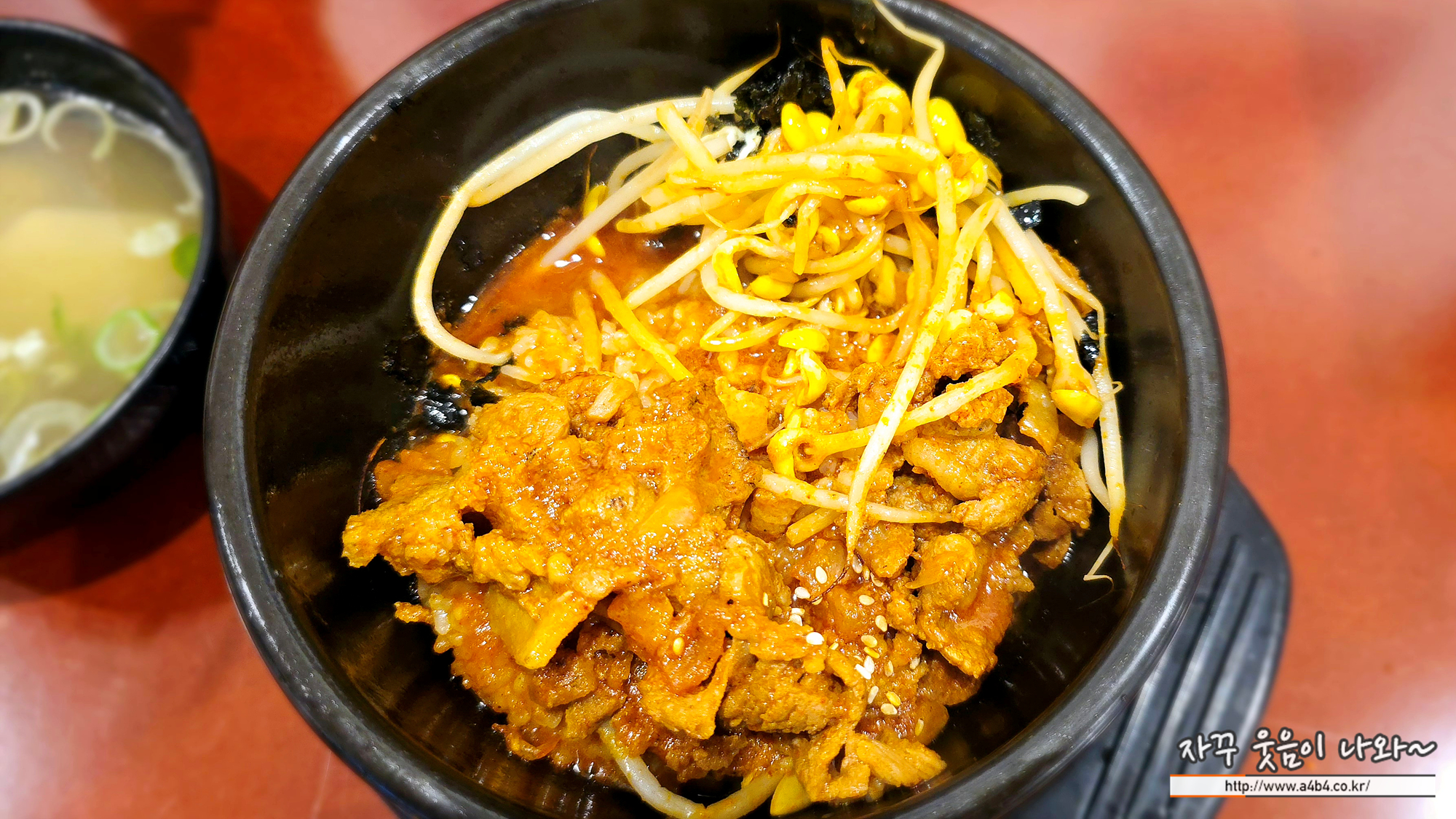구성은 제육볶음, 콩나물, 그리고 맨 아래에 밥이 깔려있고요. 제육덮밥 생각하시면 됩니다. 또한 천천히 식사하시면 마지막에 누릉지도 맛볼 수 있는...