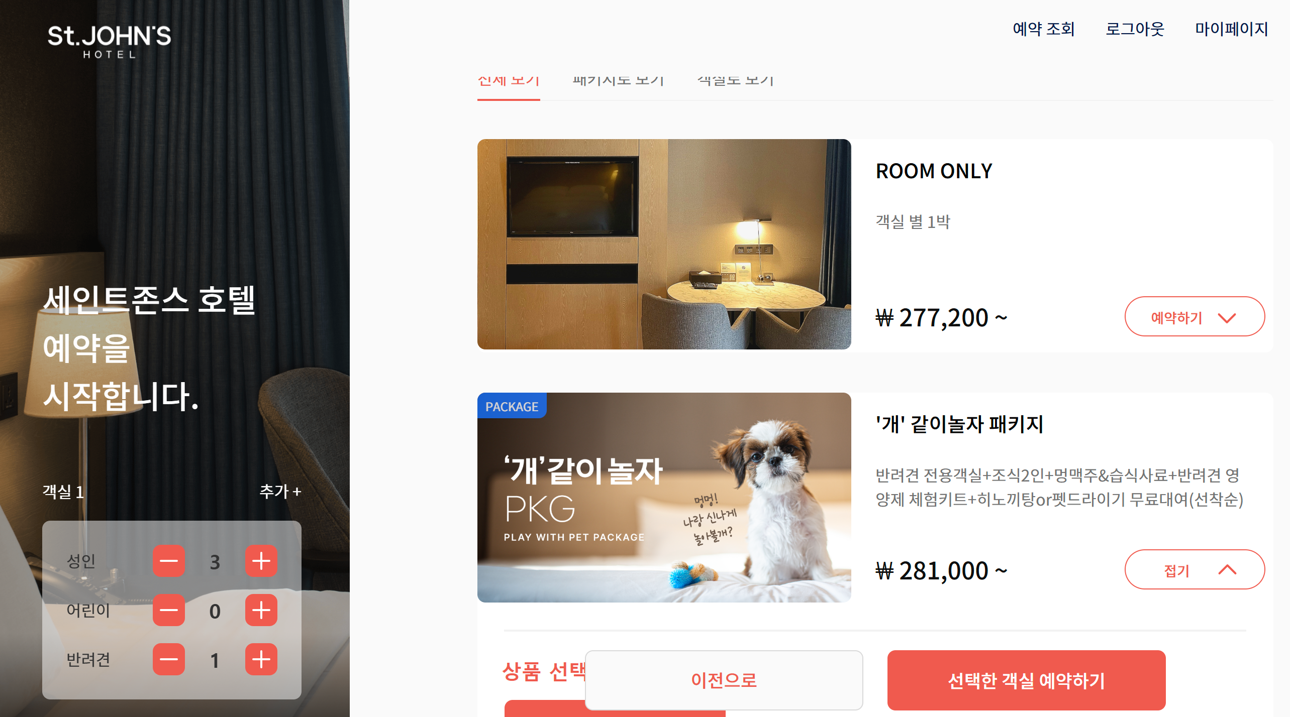 저희는 강아지와 함께 방문하였고, 세인트 존스 호텔이 펫 프랜들리 호텔로 유명해서 반려견과 함께 여행하는 고객을 대상으로 많은 프로모션이 진행되고 있습니다. 저희는 개같이놀자 패키지를 세인트존스 홈페이지 통해 예약 했습니다.