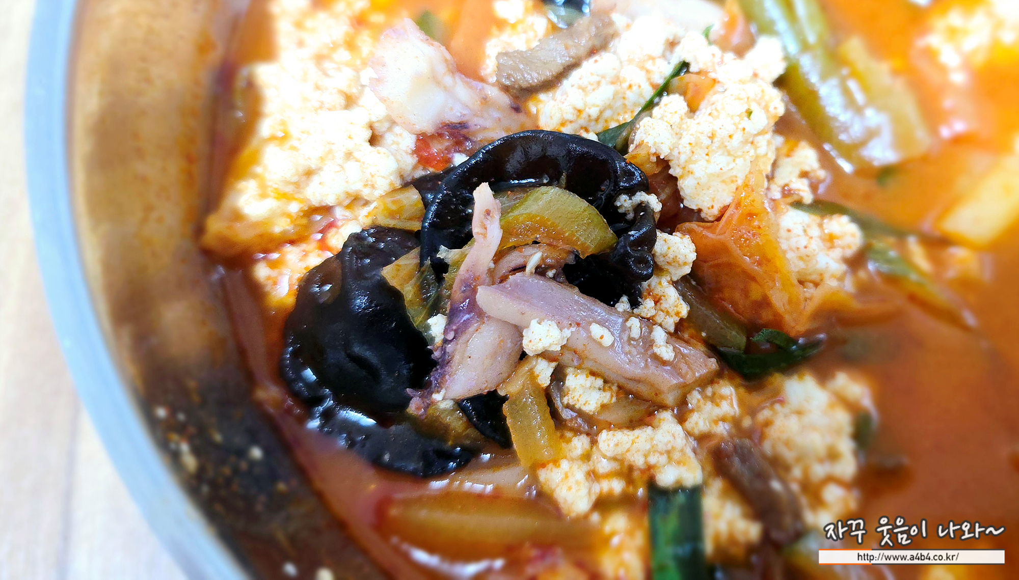 '짬뽕순두부' 이름과 같이 짬뽕국물에 목이버섯 오징어 등의 해산물과 고기에 초당순두부가 푸김하게 들어있네요. 맵기는 아주 맵지는 않습니다. 일반 중식당의 짬뽕보다 약간 덜 맵다는 느낌이 듭니다.