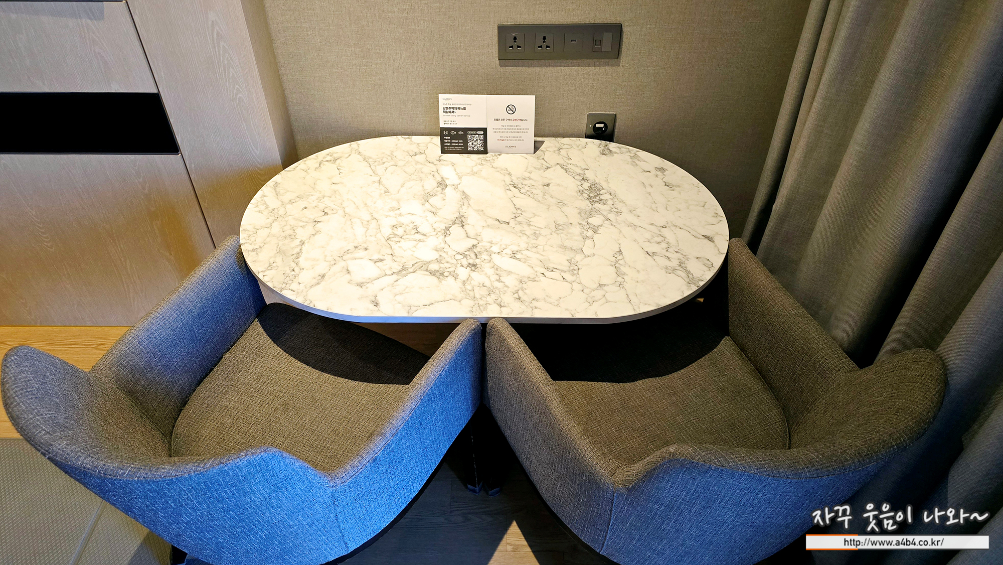 밖에서 음식을 구입해서 오거나, 배달음식 주문 또는 세인트존스호텔에 있는 맛집에서 룸서비스도 가능한데요. 3명이 음식을 먹기에는 다소 불편한 부분이 있습니다. 테이블 옮기고 한 명은 침대에 걸터 앉아야 가능하다는...