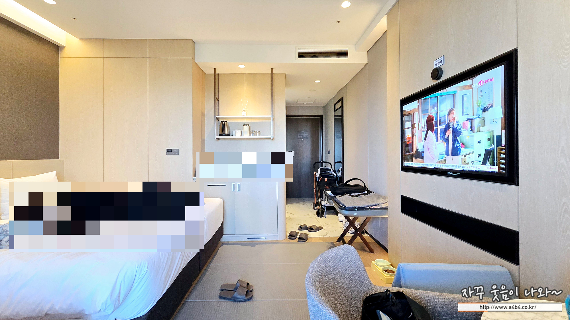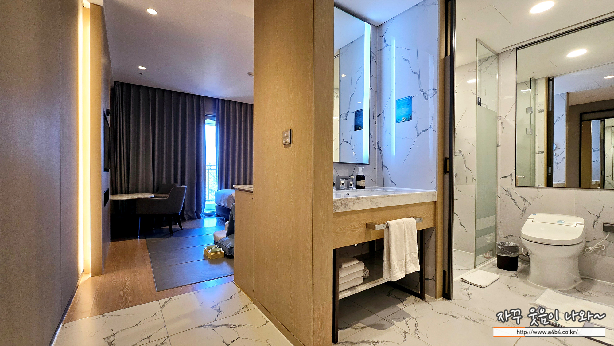 문을 열고 바로 들어간 사진입니다. 오른쪽으로는 화장실과 샤워부스, 옷장이 있고요. 안쪽으로 침대가 분리되어 있습니다.