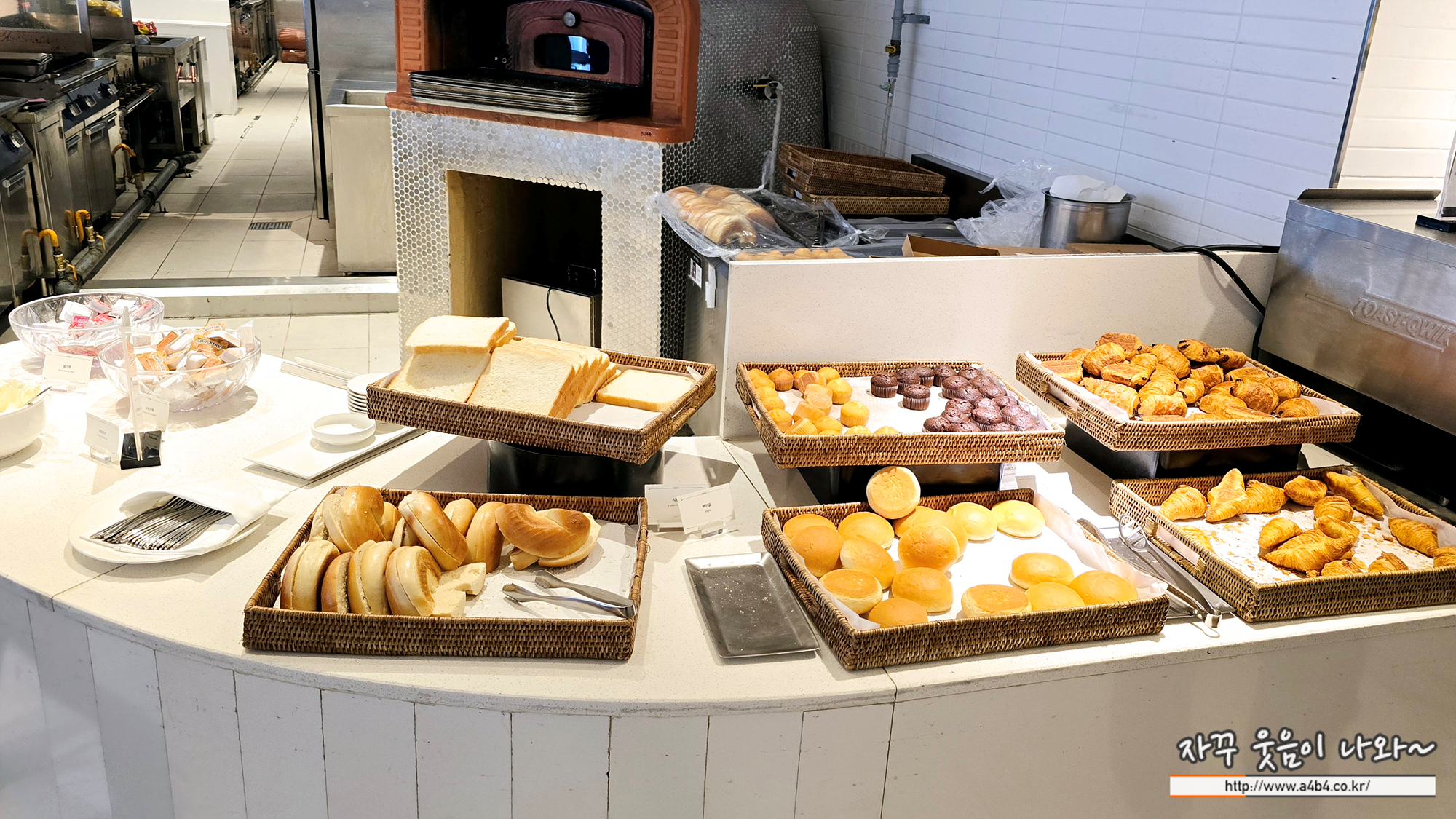 한 켠에 다양한 빵과 잼들, 그리고 시리얼과 우유, 오거트 등을 만나볼 수 있습니다.