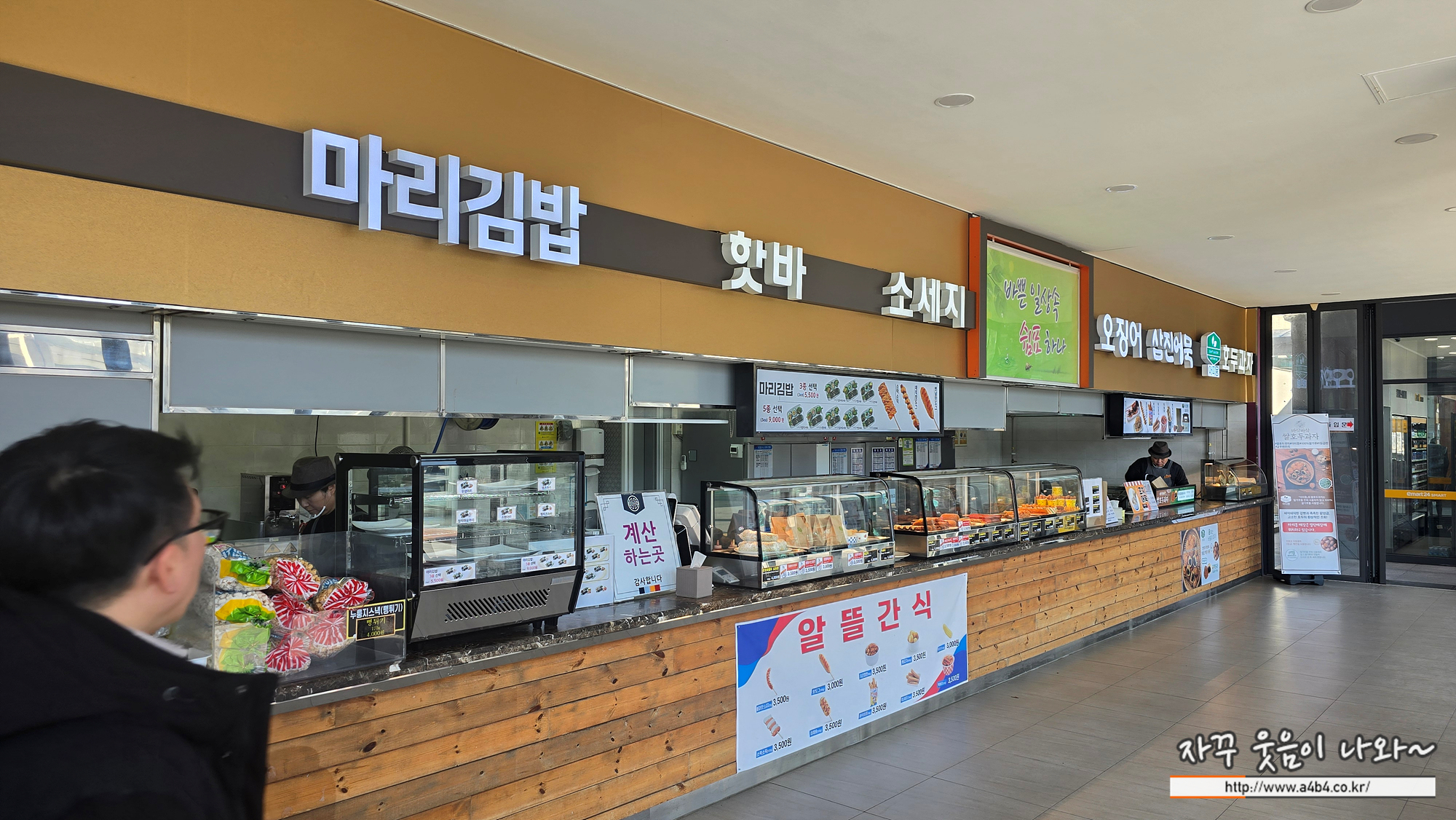 강릉 대관령휴게소 간식 매대입니다. 마리김밥, 핫바, 소세지, 오징어, 어묵, 호두과자가 있고요. 떡볶이도 있었던 것 같은데요. 대형 휴게소에 비해서는 다소 아쉬운 구성을 보입니다.