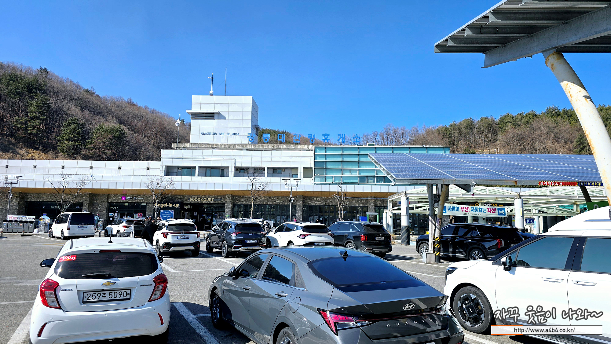 주차장은 사진과 같이 일요일 오후에 방문 했는데, 강릉 대관령휴게소 주차장은 상당히 여유 있었습니다. 또한 주차장에 그늘막이 있어 비가오거나 눈이오는 날에도 편하게 승하차가 가능합니다. 또한 사선 주차장으로 옆차에 크게 방해받지 않고 주차는 가능하지만 차간 간격이 여유 있지는 않습니다.