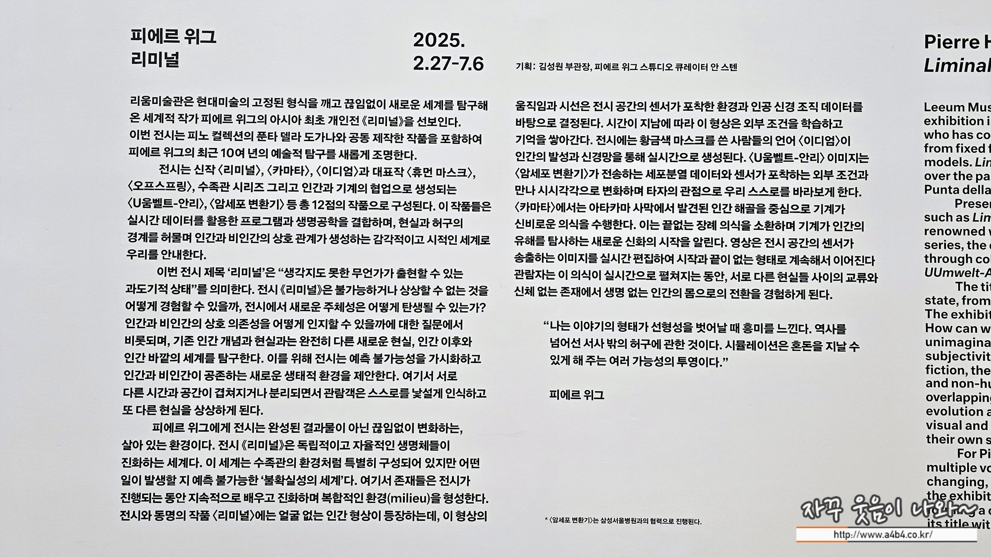 지난 금요일인 2월 27일 부터 이태원 리움미술관에서 열리고 있는 '피에르 위그 리미널' 관람후기 입니다.