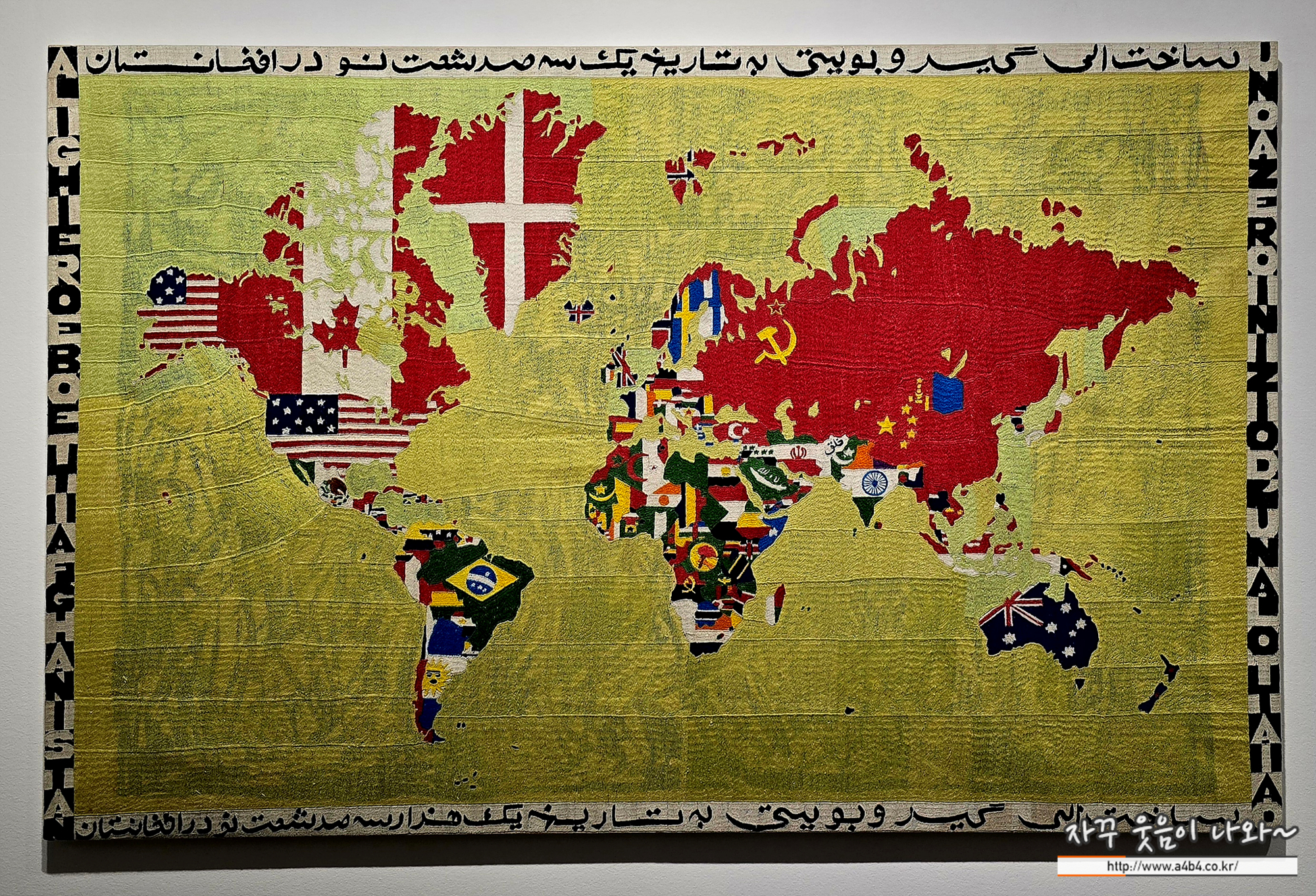 알리기에로 보에티는 이탈리아에서 시작된 아르테 포베라 미술 운동의 핵심 작가이자 선구적인 개념미술가입니다. 작가의 대표적인 연작 중 하나인 이 작품은 세계 지도의 윤곽 안에 각 나라의 국기를 수놓아 영토를 표시한 작품입니다. 작가는 1971년 아프가니스탄으로 떠나 그곳에 머물면서 전통 카펫을 만드는 장인들과 교류하며 이 연작을 제작했습니다. 그는 각 나라의 국기로 영토를 표시하는 세계지도를 만든다는 아이디어만 내고 제작은 서아시아 지역의 전통 자수 기법으로 장인들이 작품을 만들어내는 방식을 제안했습니다.