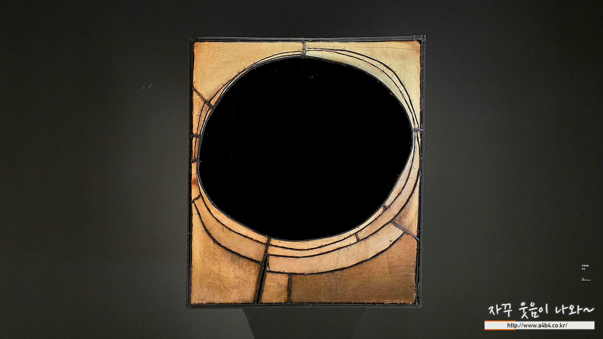 철골 구조에 캔버스 천 조각들을 철사로 꿰매어 :만든 이 작품은 본테큐가 새로운 형식을 실험하며 자신만의 예술세계를 구축하던 시기의 대표작입니다. 작가는 말합니다. "나는 내가 살고 있는 세상의 무게를, 그 공포와 아름다움 모두를 작품에 담고 싶었다. 이어붙인 천들은 그 일환이다. 연약하지만 서로 붙들고 있다." 철사로 잇대어진 천 조각들은 상흔을 연상시키지만, 우리의 눈길을 가장 끄는 중앙의 검고 둥근 구멍은 우리의 시선을 텅 빈 내부로 이끌며 더 폭넓고 자유로운 사유를 유도합니다. 본테큐 예술의 가장 특징적인 조형 요소인 이 검고 둥근 구멍은 세계에 대한 작가의. 그리고 관람자의 해석으로 채워지는 열린 공간이기도 합니다