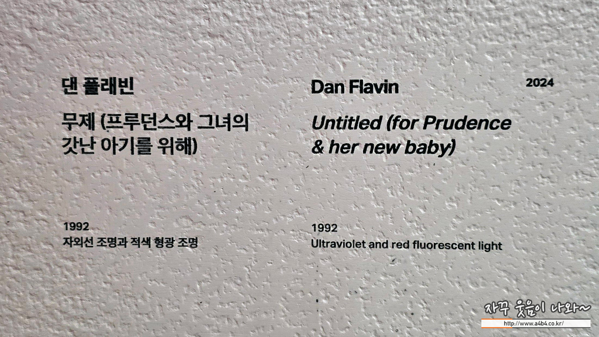 그는 종종 일찍 사망한 쌍둥이 형제와 같은 그의 가족 혹은 친구, 그에게 영감을 준 이들을 위한 작품을 제작하기도 했습니다. 그 중에서도 이 작품은 1990년부터 작가가 사망할 때까지 그의 스튜디오 매니저였던 프루던스 페어웨더의 출산을 축하하며 그에게 헌정하는 작품입니다. 작가의 작업은 일상 용품인 형광등과 전기 조명의 색채적, 공간적 성질에 대한 고찰에서 출발하여 기하학적으로 구성된 빛을 통한 감상의 몰입을 이끌어냅니다