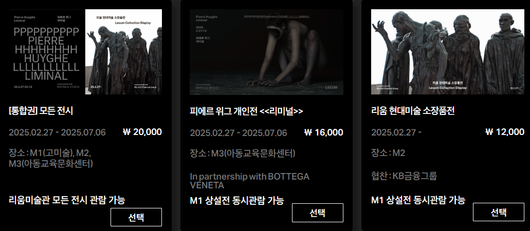 리움 현대미술 소장품전 입장료는 12,000원 입니다. 또한 현재 M3에서 열리고 있는 피에르 위그 개인전 '리미널'의 경우 입장요금이 16,000원 인데요. 두 전시회를 모두 볼 수 있는 통합권이 20,000원 입니다.