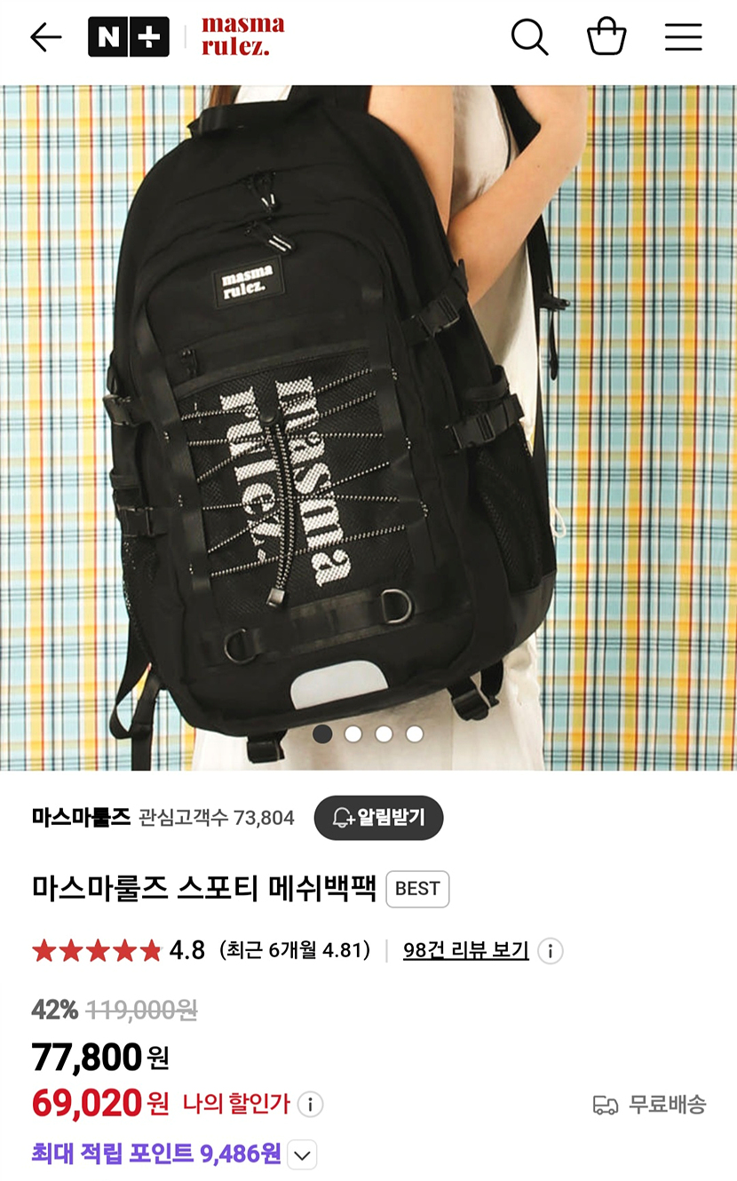 오늘 소개하는 Masmarulez Sporty mesh backpack_Black 정가는 119,000원 입니다. 현재 마스마룰즈 공홍이나 네이버스마트스토어에서는 알림허용 등 이런저런 옵셥 동의하면 정가대비 42% 할인된 가격인 69,020원에 구입이 가능합니다.