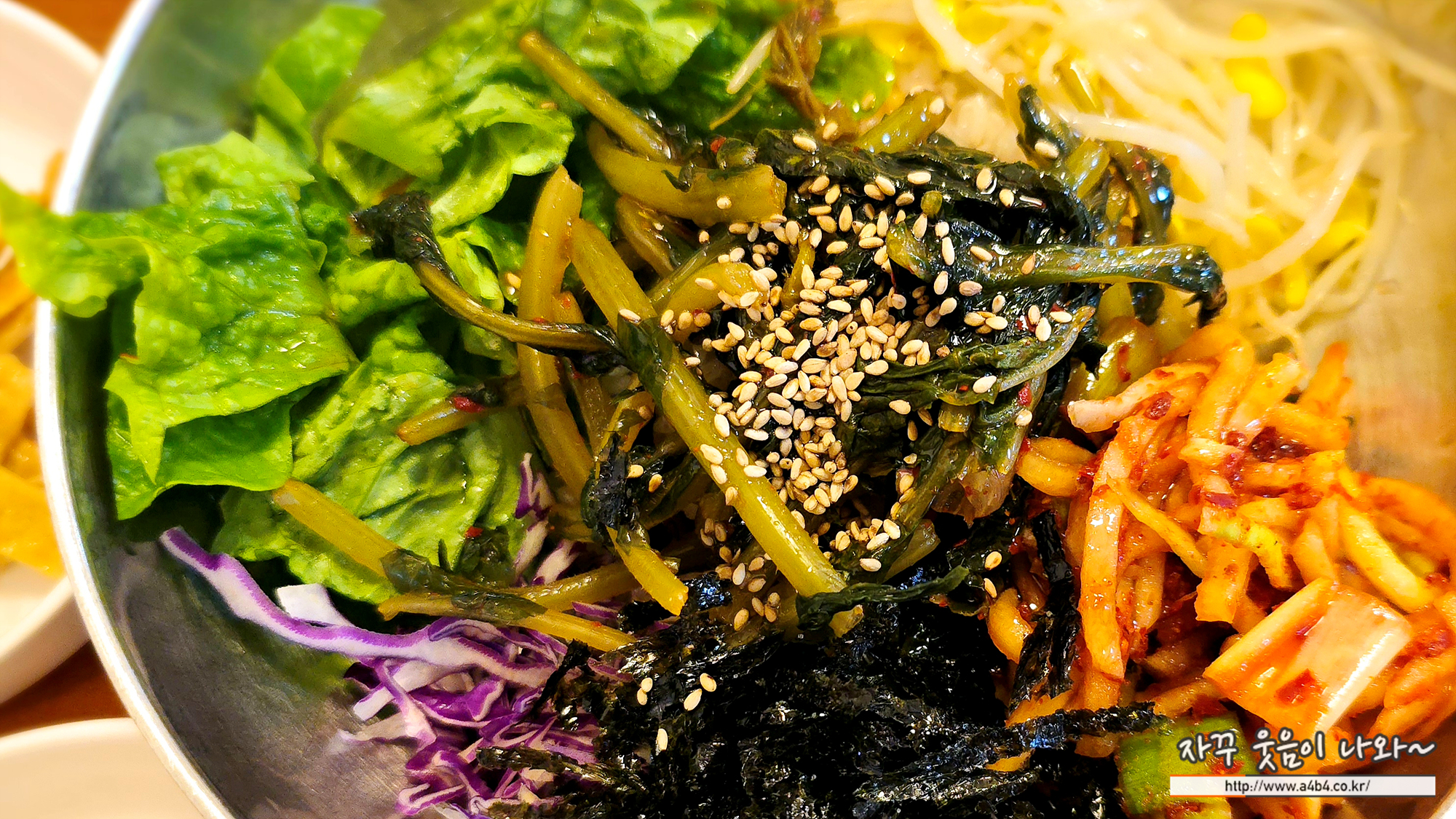 열무김치와 무채나물, 콩나물과, 상추, 양상추, 김등이 들어간 야채 비빔밥입니다.