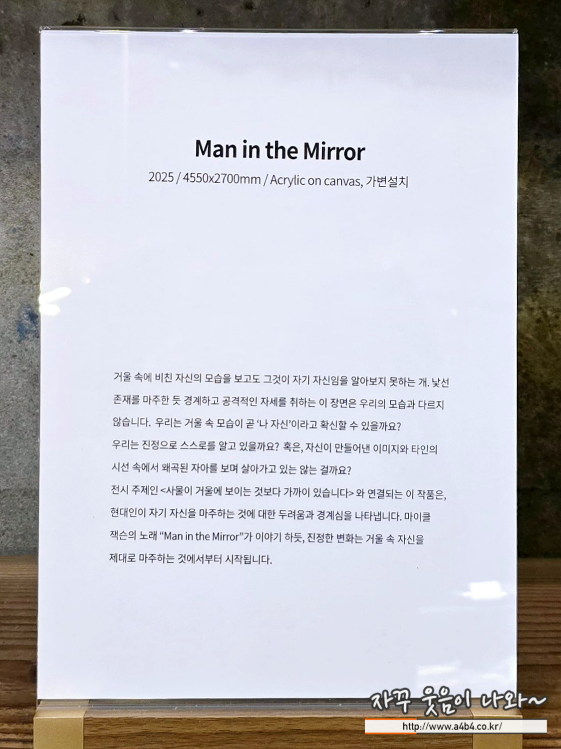 전시 주제인 <사물이 거울에 보이는 것보다 가까이 있습니다> 와 연결되는 이 작품은 현대인이 자기 자신을 마주하는 것에 대한 두려움과 경계심을 나타냅니다. 마이클 잭슨의 노래 "Man in the Mirror"가 이야기 하듯, 진정한 변화는 거울 속 자신을