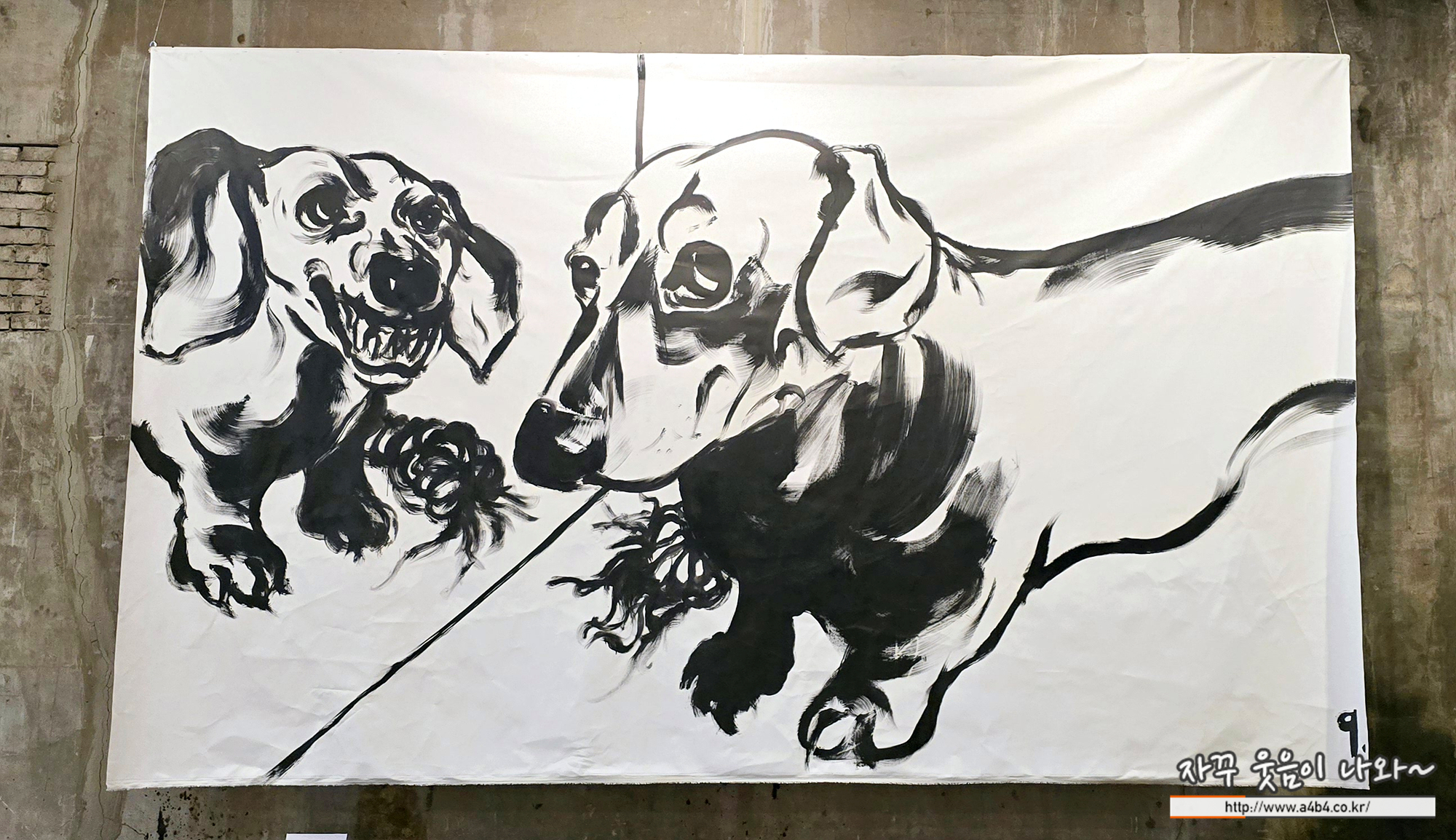 성수동 대림창고 갤러리 왼쪽 옆 공간으로 이동합니다. 이곳에도 카페 끝부분에 대형 작품 한점이 걸려 있는데요. 작품에 대한 제목이나 설명을 찾지 못했습니다. 아쉽게도...