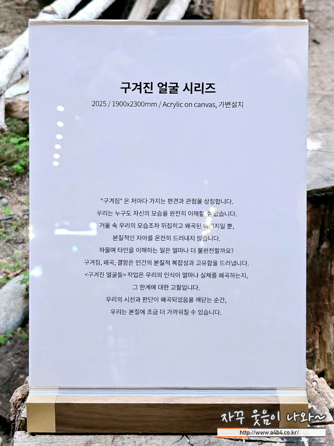 우리는 자신에 대해 제대로 알고 있는가? 스스로 만들어낸 이미지와 타인의 시선 속에서 왜곡된 자아를 보며 살아가고 있는게 아닌가? 라는 질문을 던집니다. 우리는 스스로를 이해한다고 착각하지만, 때때로 자신의 본질을 제대로 들여다보지 못한 채 경계하고 두려워합니다. 이번전시에서 작가는 구겨진 얼굴들과 거울을 마주한 개를 통해 왜곡된 시선 인식의 한계, 그리고 본질과의 거리를 이야기합니다