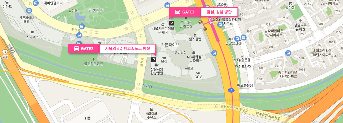 대중교통으로 가든파이브 방문시에는 지하철 8호선 장지역 4번 출구와 연결되어 있습니다.