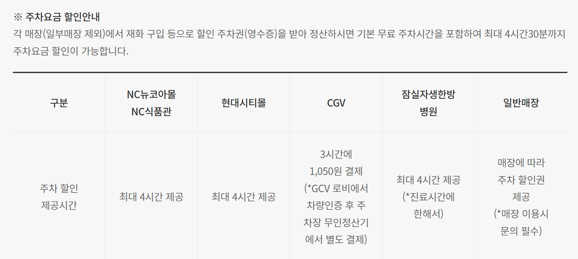 NC뉴코아몰, 백화점, 식품관, 현대시티몰 이용고객은 구매금액과 상관없이 구매영수증만 있으면 4시간 무료주차가 가능합니다. 다만 일반매장은 구매금액 및 매장정책에 따라 가든파이브 주차요금 할인정책이 상이합니다.