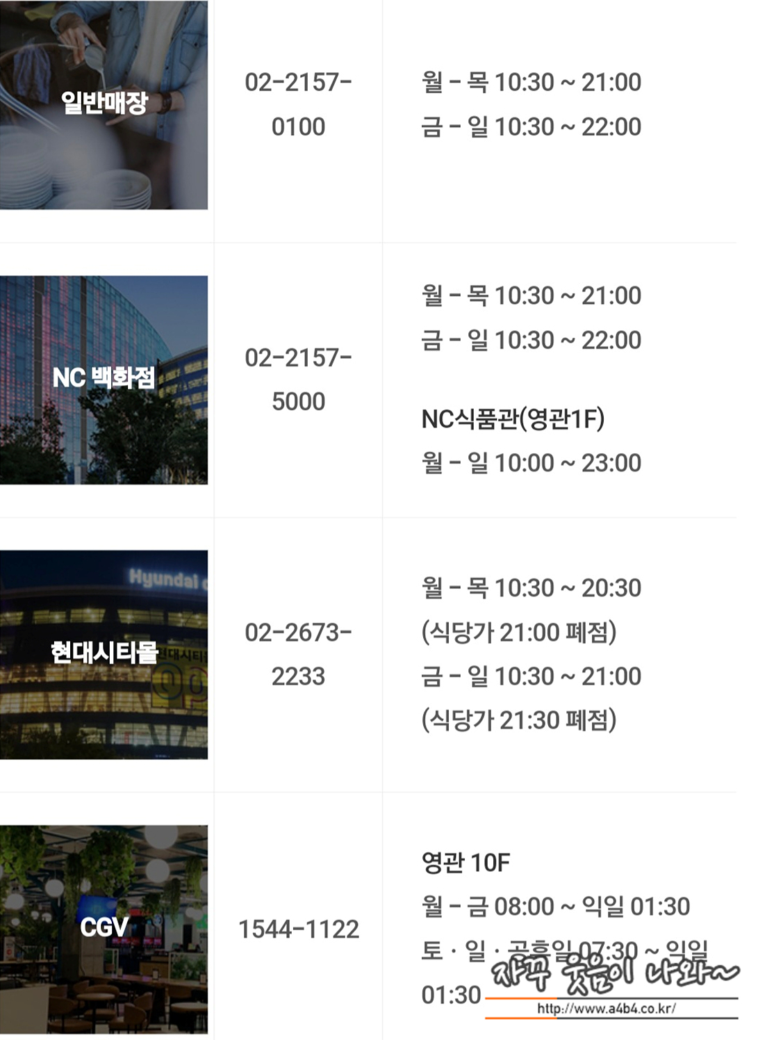 패션관, 영관, 리빙관, 테크노관 4개의 관으로 구성되어 있으며, 패션관과 영관은 NC 백화점 리빙관과 테크노관은 현대아울렛 가든파이브점으로 구성되어 있습니다.