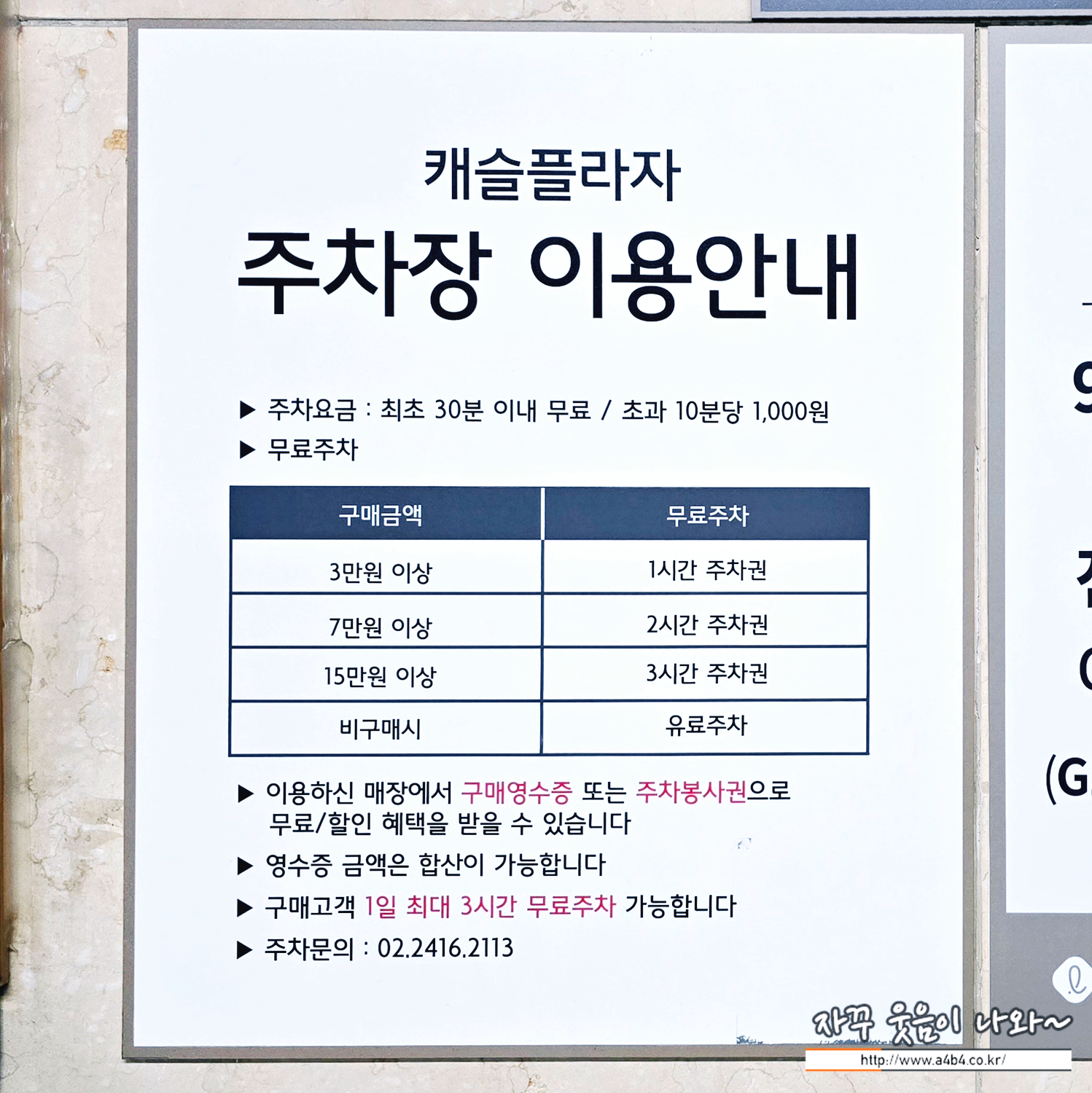 애슐리퀸즈 잠실점이 위치한 잠실롯데캐슬플라자 주차요금은 최초 30분 무료, 초과 10분당 1,000원 주차요금이 발생합니다. 3시간 주차시에는 15,000원의 주차요금이 발생하는데요. 구매금액에 따라 무료 주차가 가능합니다.