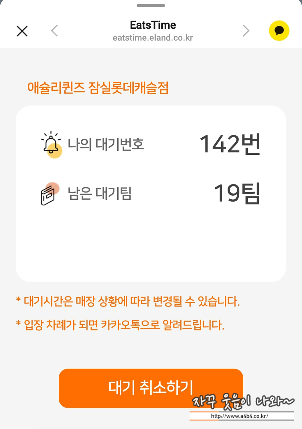 현장예약을 하면 카카오 알림톡을 통해 대기번호와 함께 앞에 남아있는 팀을 확인할 수 있습니다.