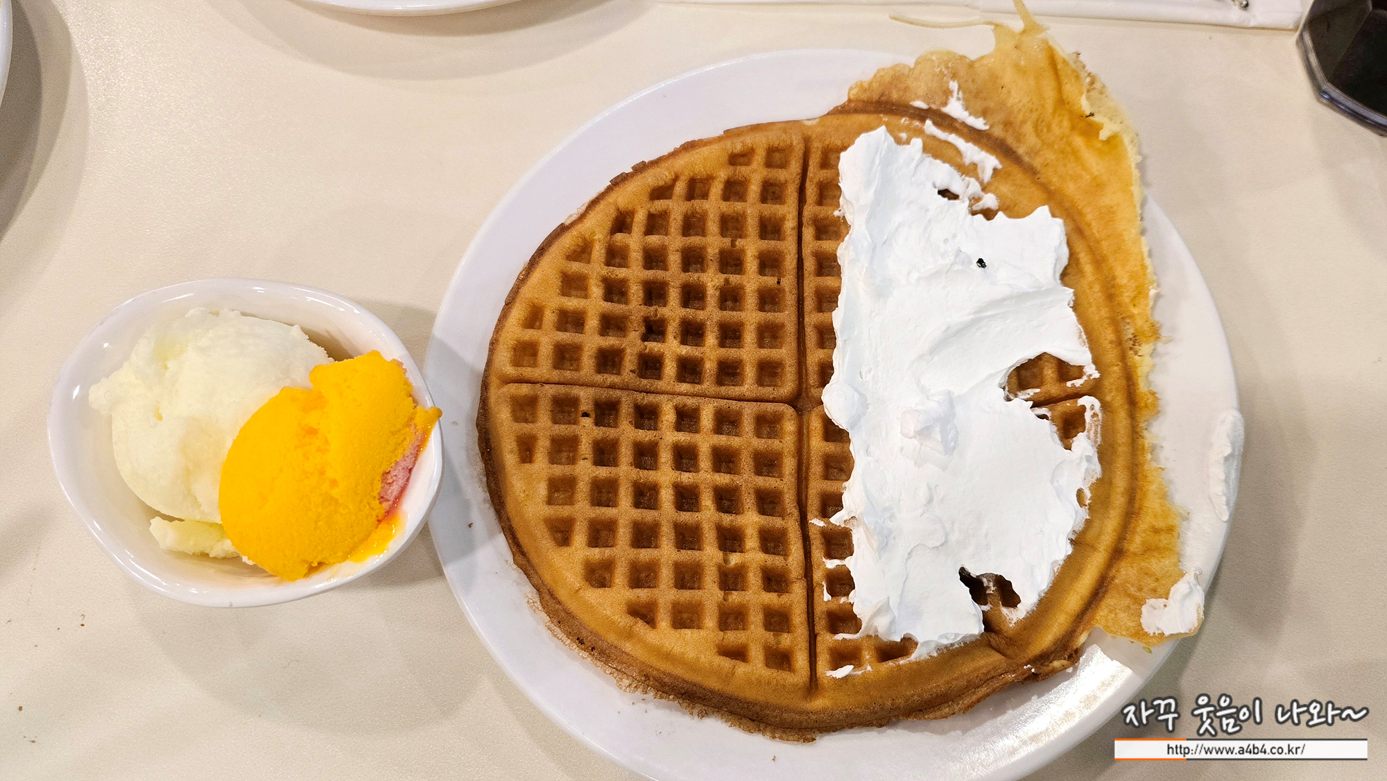 직접 만들어 먹을 수 있는 와플과 다양한 토핑...