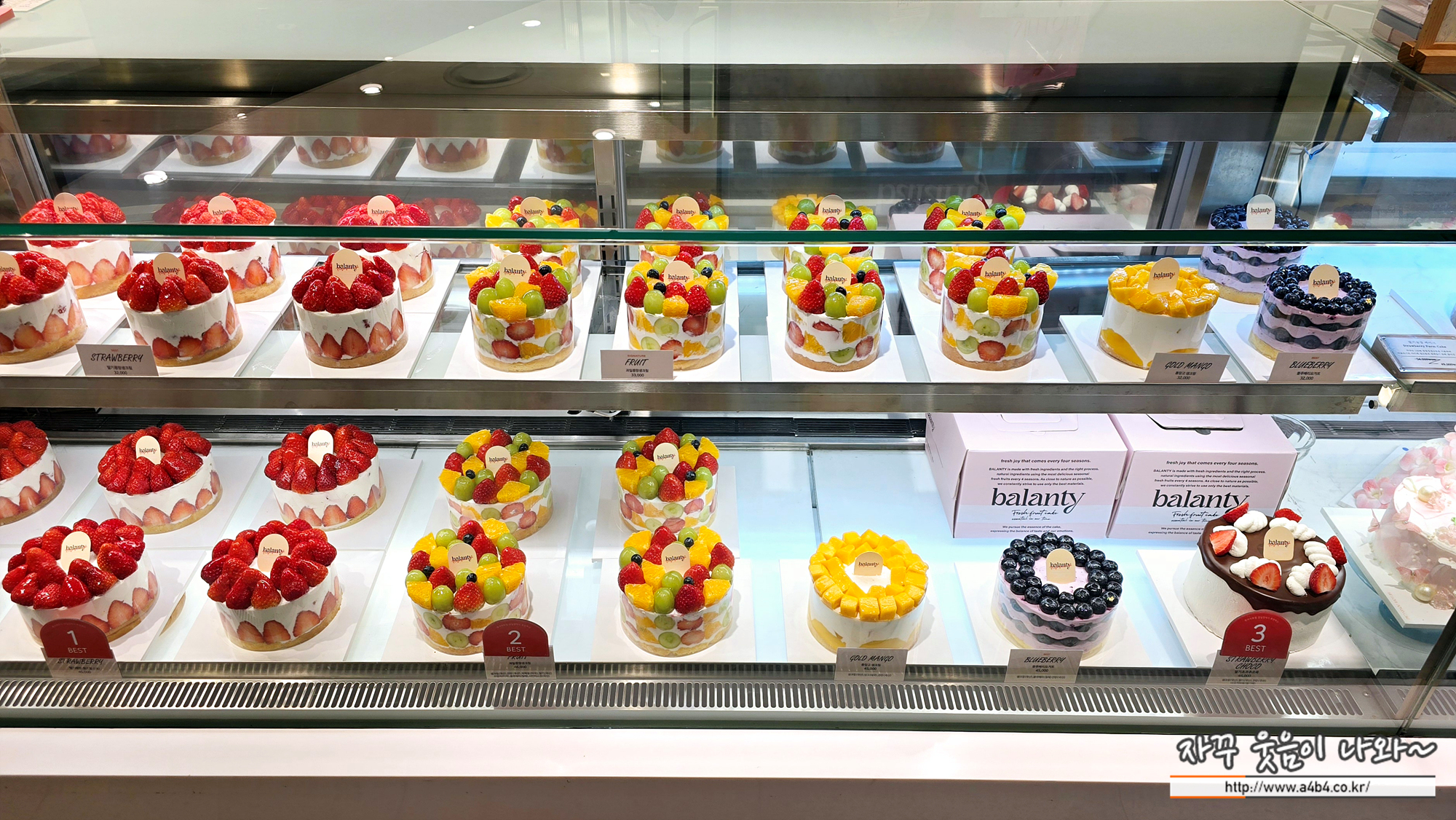 100% 동물성 우유 생크림과 매일 청과시장에서 공수하는 제철 생과일 그리고 매일 당일 직접 구워 낸 시트로 재료 본연의 맛을 중시하는 생과일 케이크 전문점 밸런티도 입점해 있습니다. 밸런티 케이크 가격은 5만 원 전후, 3만원 대 합리적인 가격의 케잌도 있습니다.