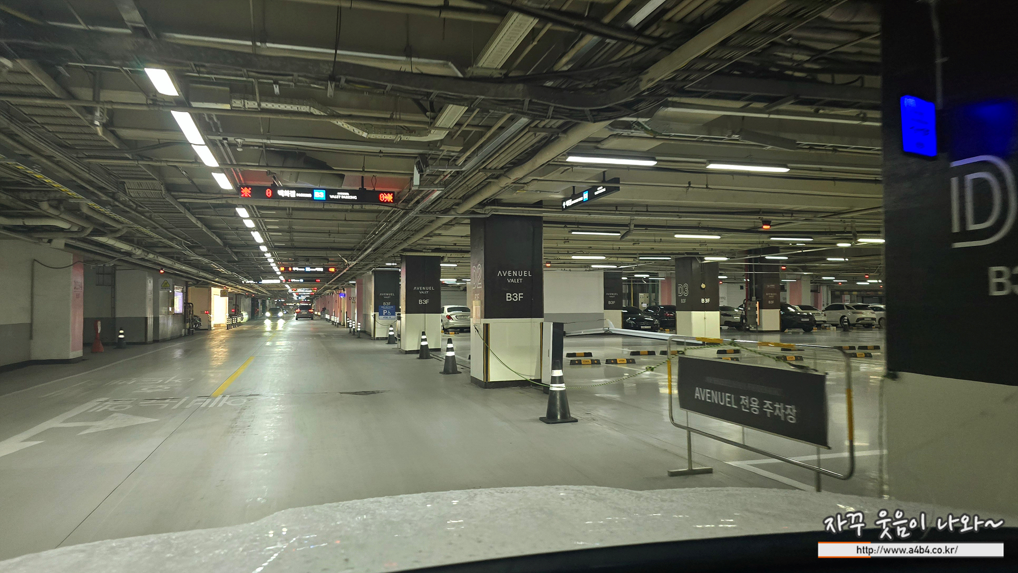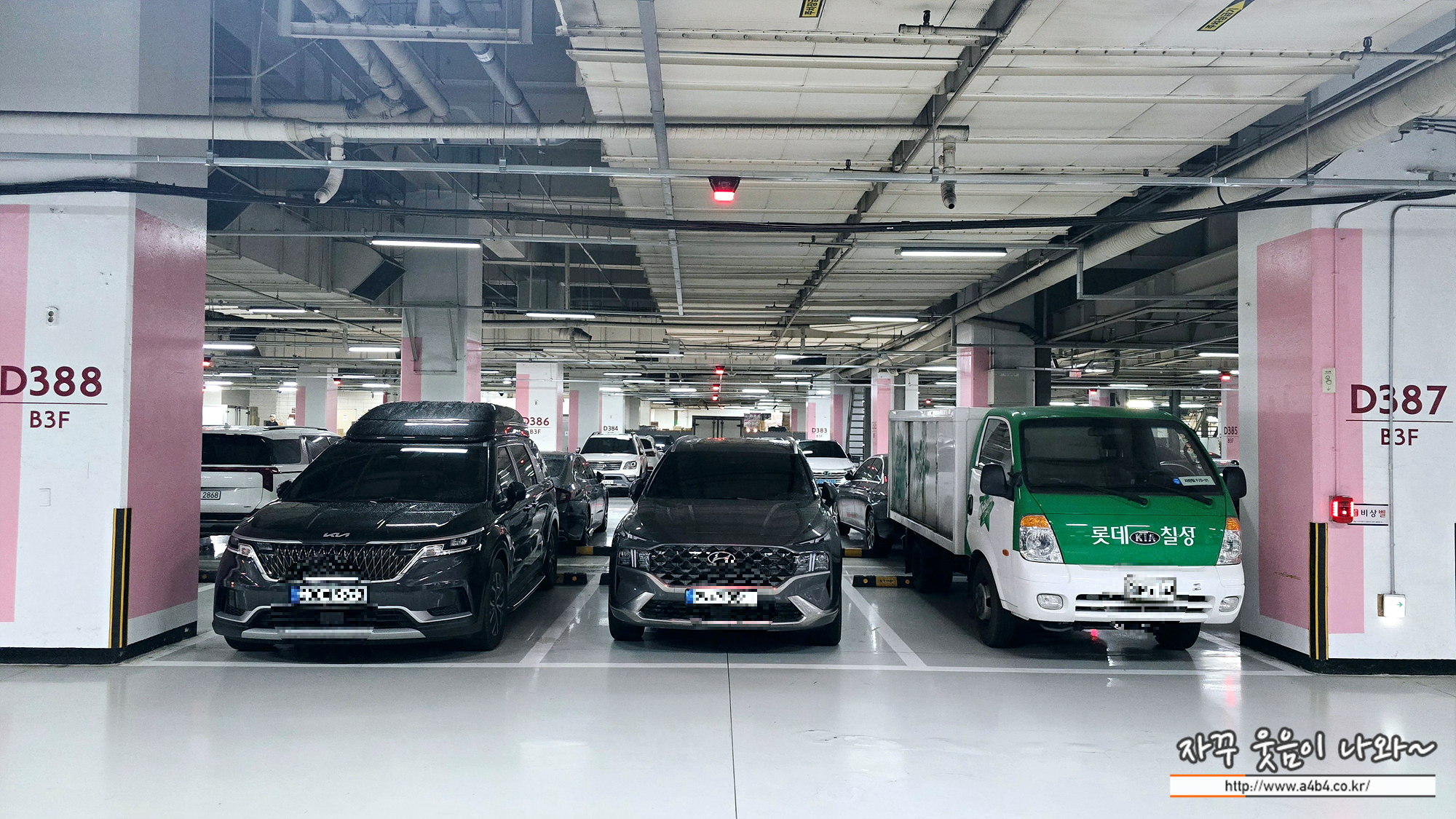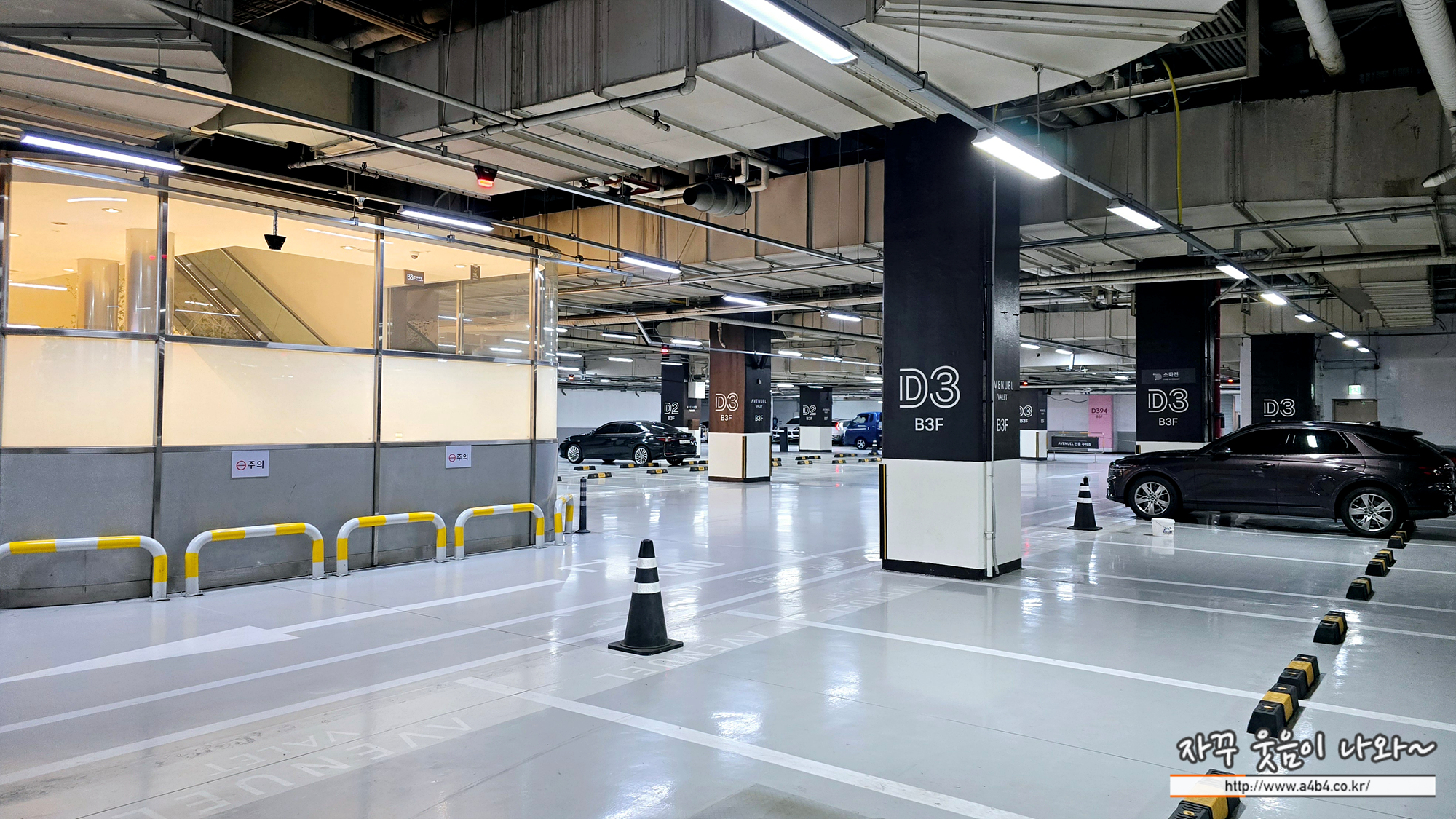 지하 2층과 3층 일부 백화점 접근성이 가장 좋은 공간은 에비뉴엘 주차장으로 VIP 고객 대상 발렛주차 공간입니다. 뭐 백화점이 자본주의 시장경제의 상징과도 같은 곳이어서 이런 우대 차별은 당연하다는 생각이고요. 이 텅 빈 공간을 지나 일반 고객이 이용할 수 있는 잠실 롯데백화점 주차장은 지하 3층 일부와 지하 4층에 있습니다.