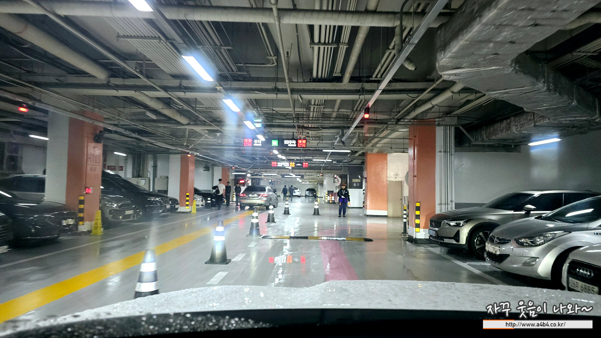 운 좋기 지하 3층 백화점 근처 주차공간이 나와서 편하게 주차 했고요. 사진과 같이 주차장 주차공간 폭이 좁지는 않습니다. 중대형 차량의 경우 큰 어려움 없이 주차 가능합니다.