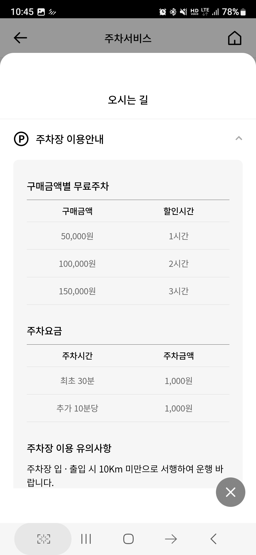 주차요금은 첫 30분 1,000원 이후 10분 초과시 1,000원 부과됩니다.
