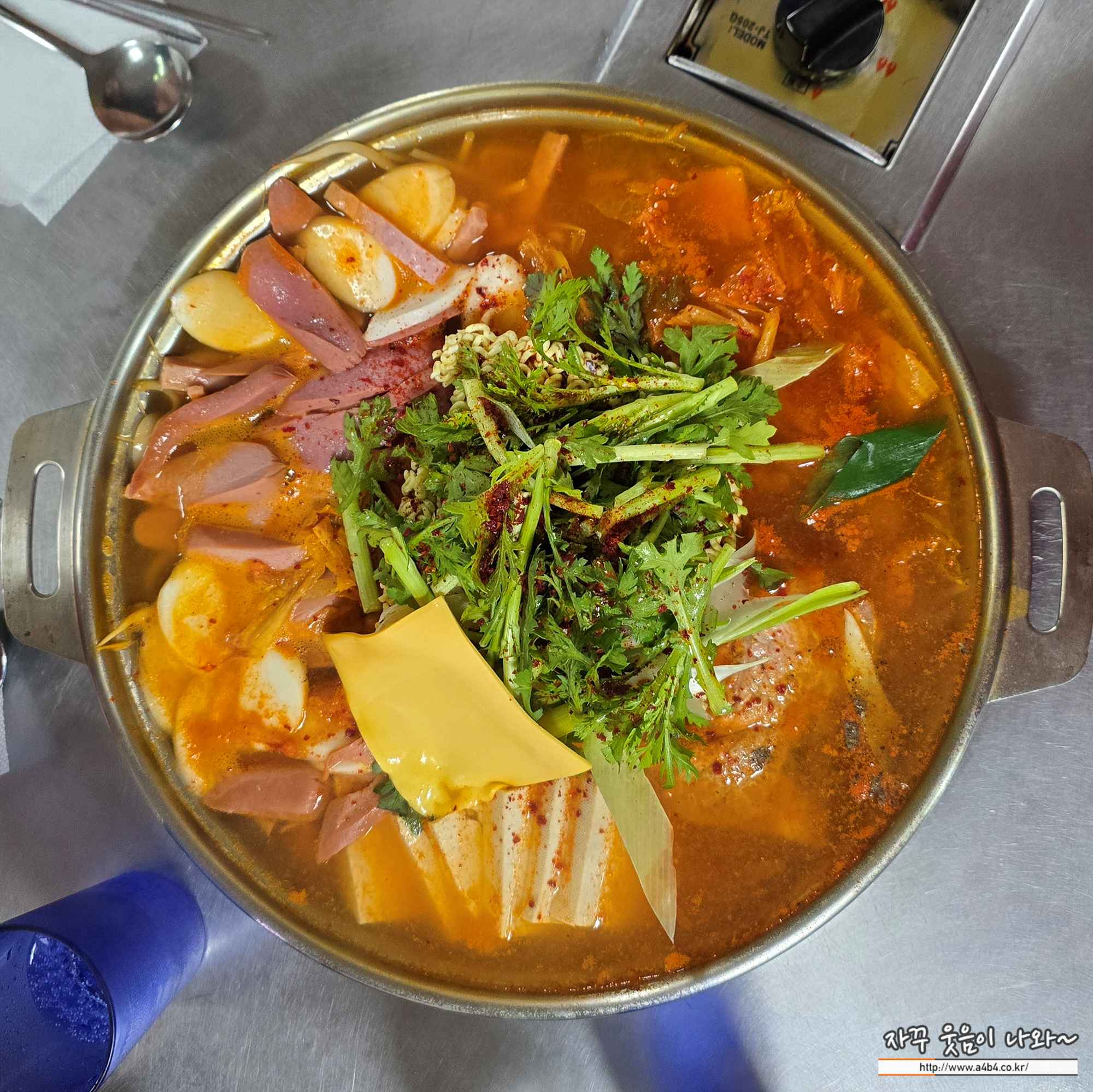 강동구청역 맛집 통큰양푼이찌개 본점 부대찌개 사리는 두부사리와 라면사리,치즈가 기본으로 나오네요.