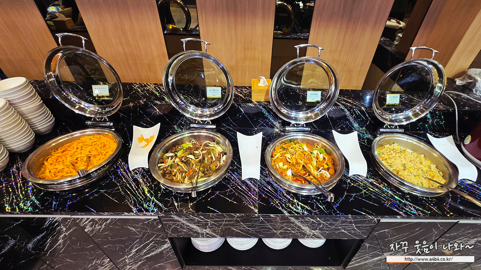 일반적인 웨딩홀 뷔페에서 볼 수 있는 음식들로 구성되어 있습니다.