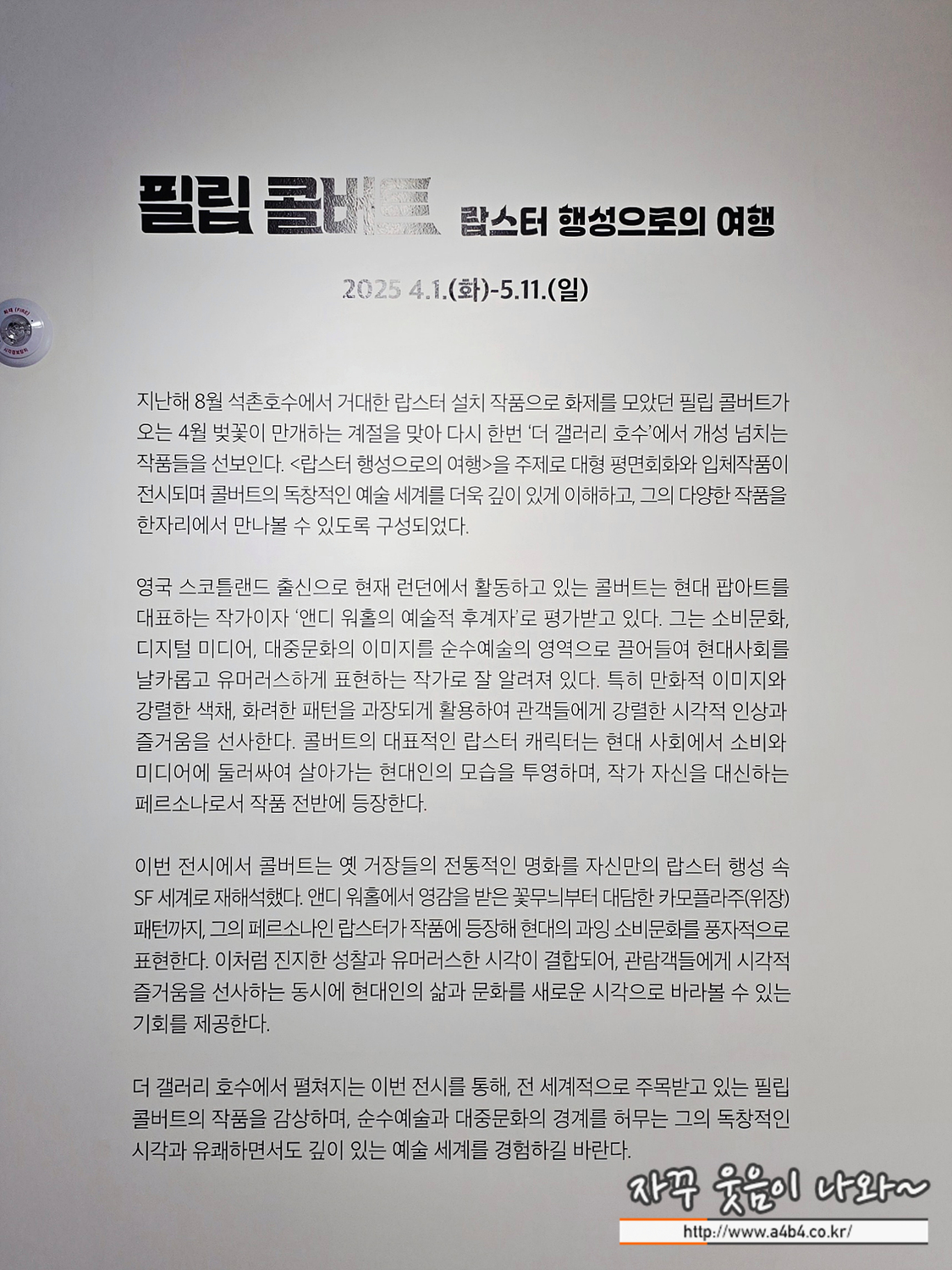 갤러리 호수에서 펼쳐지는 이번 전시를 통해, 전 세계적으로 주목받고 있는 필립 콜버트의 작품을 감상하며, 순수예술과 대중문화의 경계를 허무는 그의 독창적인 시각과 유쾌하면서도 깊이 있는 예술 세계를 경험하길 바란다.