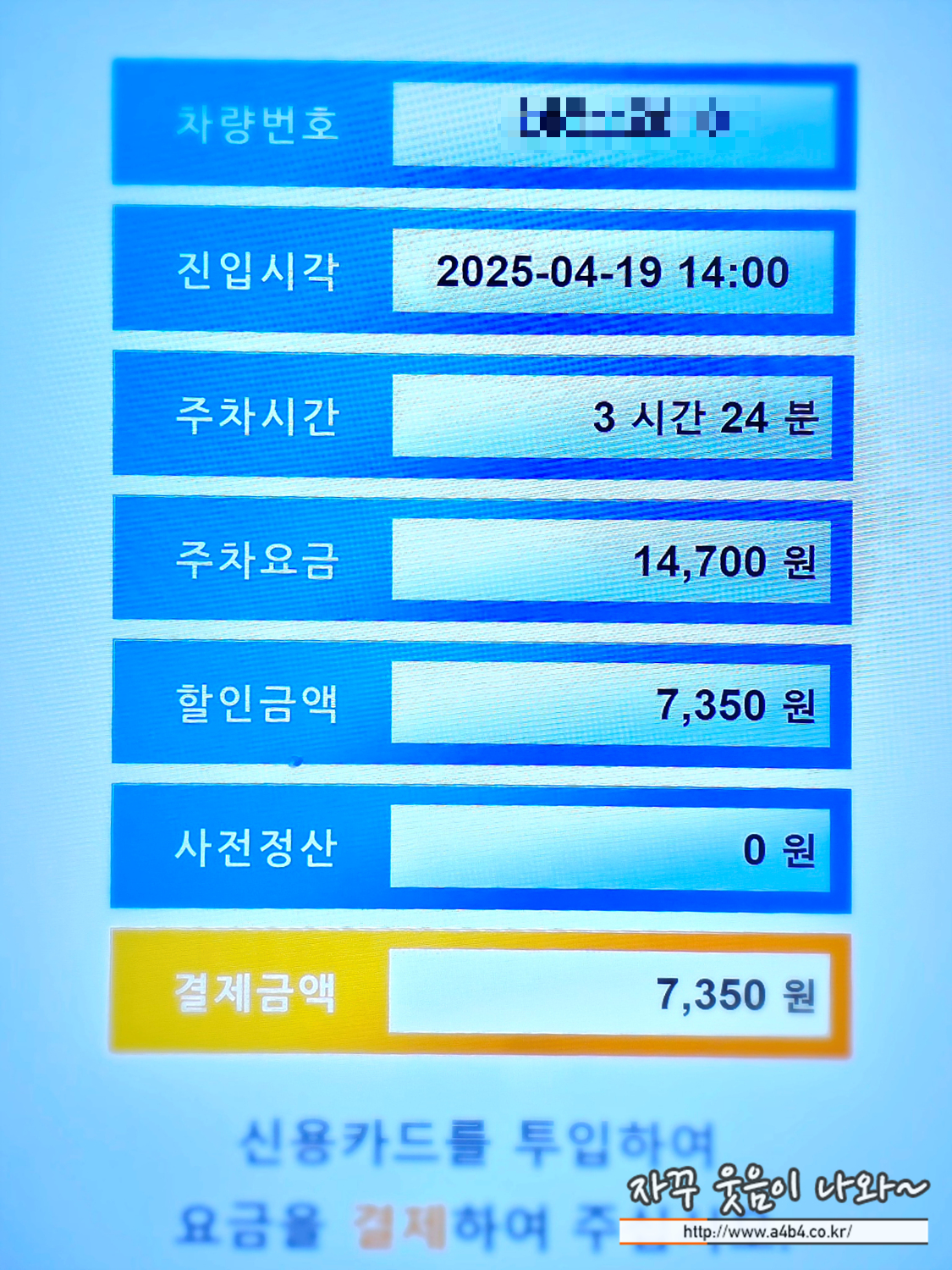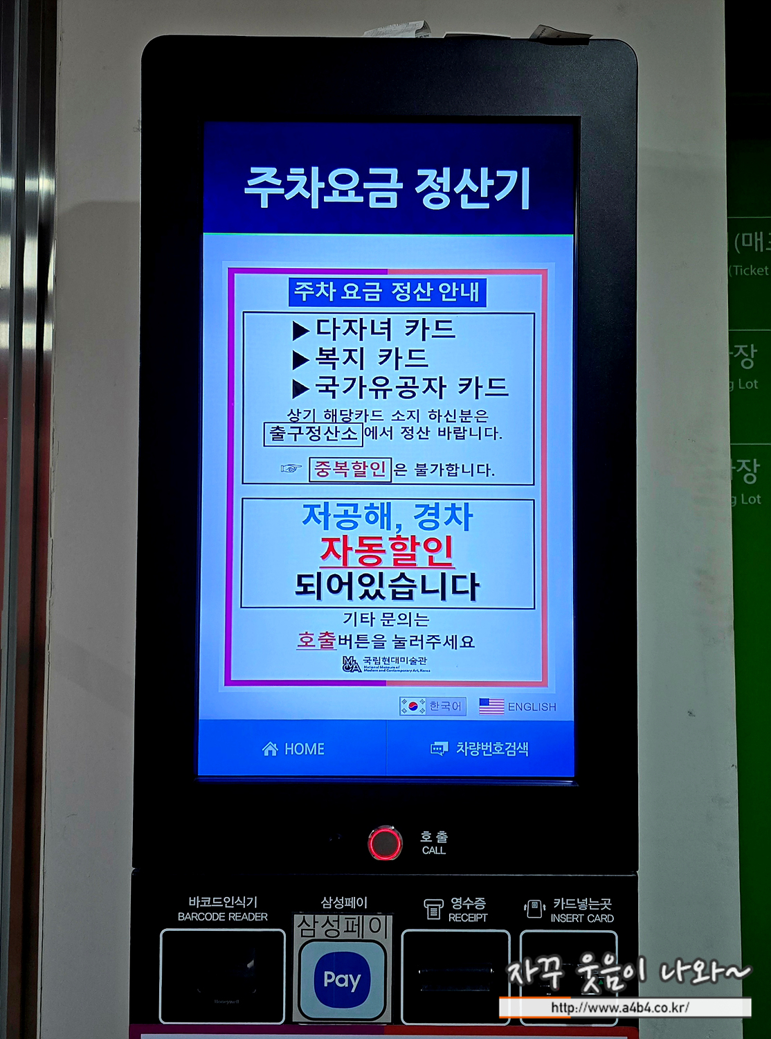 아래 주차장 입구의 무인 주차요금 정산기 이용하시면 되고요. 역시 저공해차, 경차 별도 확인없이 할인적용 되네요.