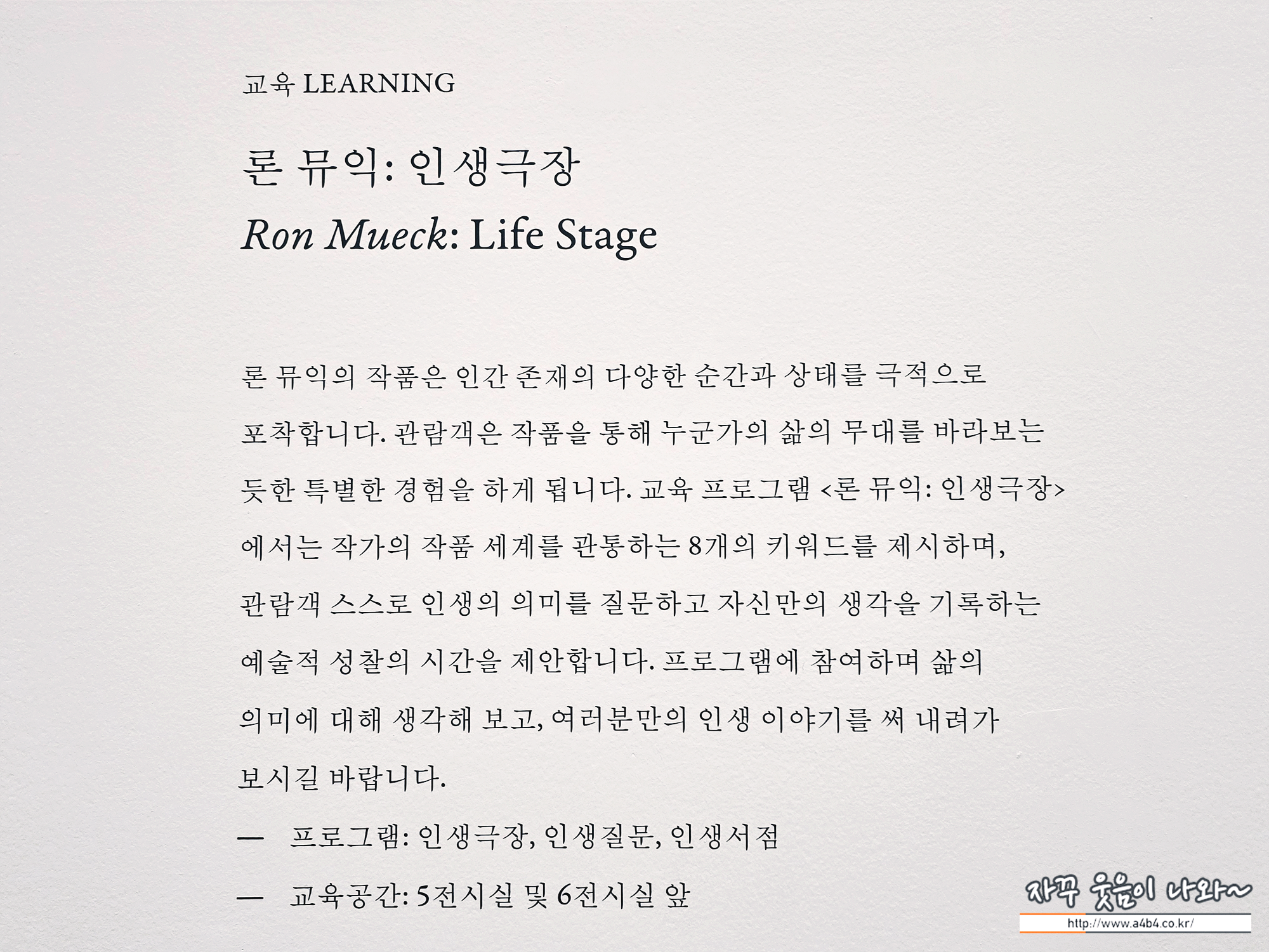 론뮤익 개인전 도슨트는 매일 13시 지하 1층 5 전시실에서 진행됩니다. 토요일 차가 막히는 바람에 늦게 도착해서 론 뮤익 전시 도슨트 듣지 못했네요.