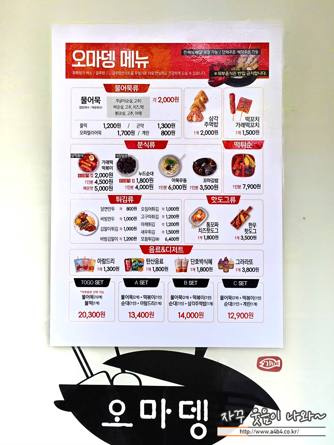 어묵과 떡볶이 순대, 꼬마김밥, 떡꼬치 등 간단한 먹거리 중심으로 오마뎅 메뉴 구성되어 있습니다. 물론 세트메뉴도...