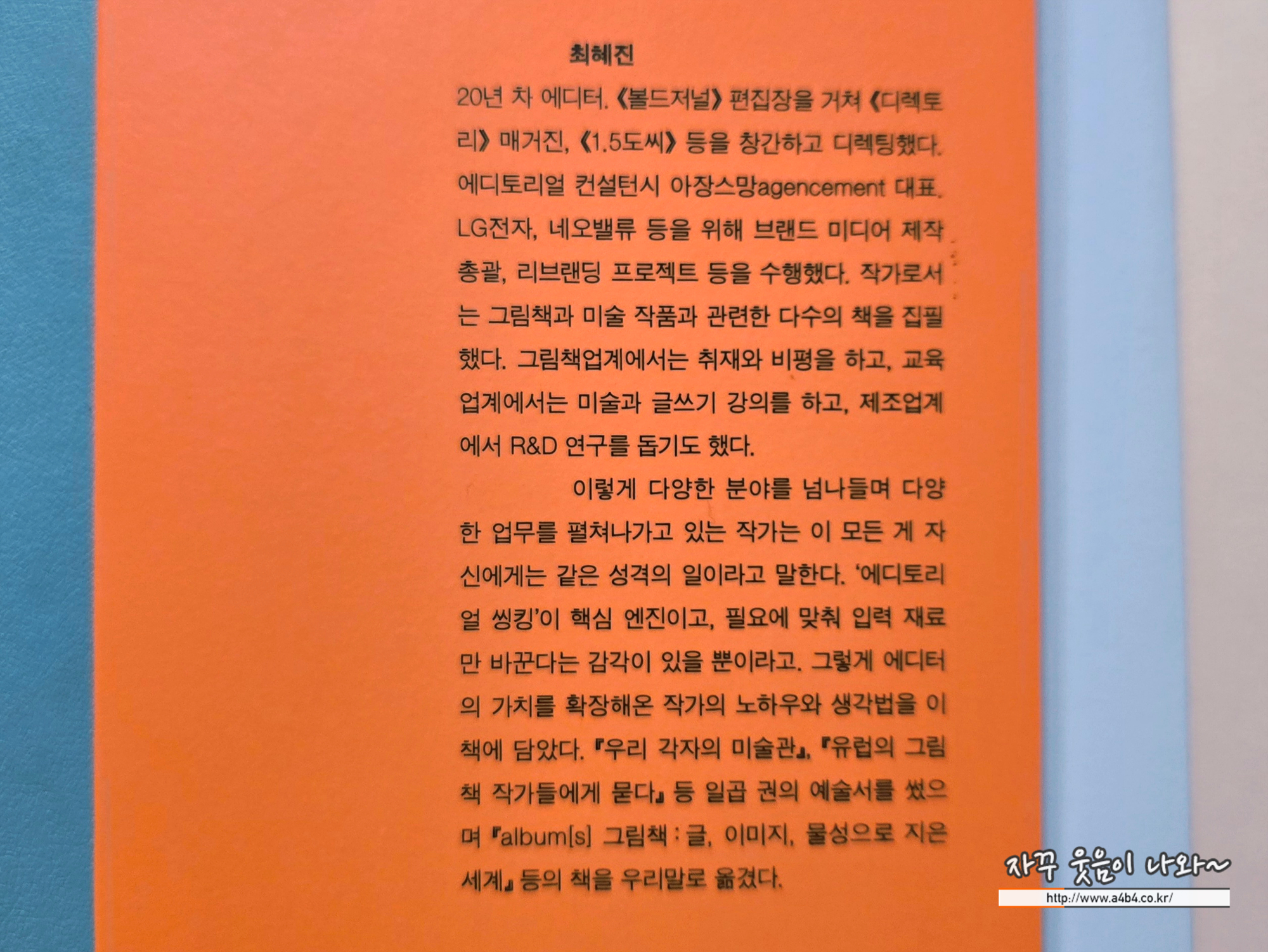이렇게 다양한 분야를 넘나들며 다양 한 업무를펼쳐나가고 있는 작가는 이 모든 게 자 신에게는 같은 성격의 일이라고 말한다. '에디토리 얼 씽킹'이 핵심 엔진이고, 필요에 맞춰 입력 재료 만 바꾼다는 감각이 있을뿐이라고. 그렇게 에디터 의 가치를확장해온 작가의 노하우와 생각법을 이 책에 담았다. '우리 각자의 미술관4' '유럽의 그림 책 작가들에게 묻다'등 일곱 권의 예술서를 썼으며 'albumls' 그림책 :글, 이미지, 물성으로 지은 세계' 등의 책을 우리말로 옮겼다.