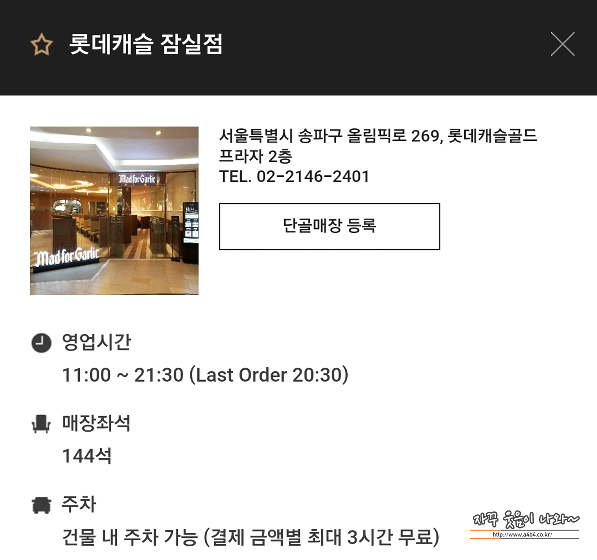매드포갈릭 잠실 주차장 및 휴무일, 통신사 할인카드