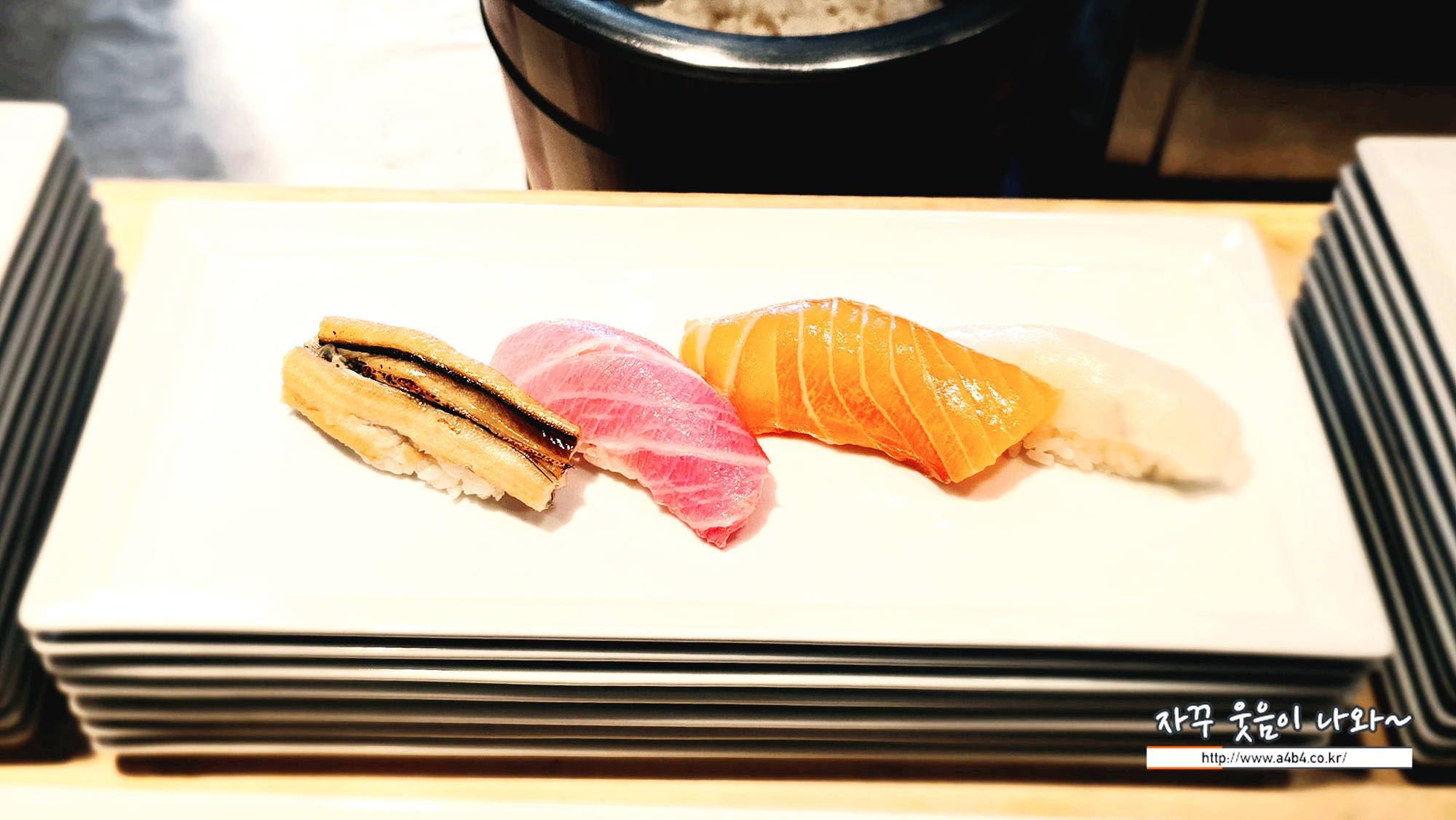 초밥은 사진과 같이 접시에 4pcs 싹 새탕되어 있습니다. 아나고 참다랑어 연어 흰살생선 초새우 등인데요. 접시에 따라 약간씩 구성이 다릅니다. 바로 앞에서 만들어 주시기에, 원하는 생선 중심으로 요청하셔도 됩니다. (연어 좋아하는 딸아이 바로 연어로만 요청 하네요.)
