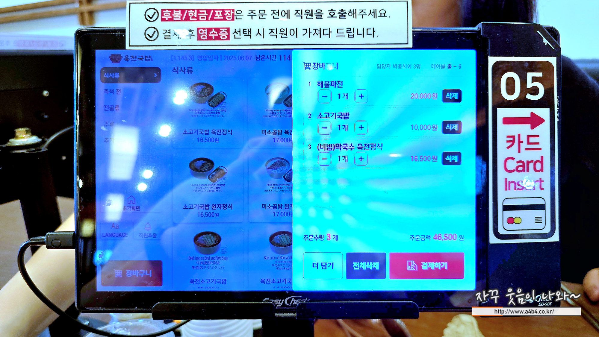 주문과 결제는 각 테이블에 있는 태블릿으로 진행하시면 됩니다.
