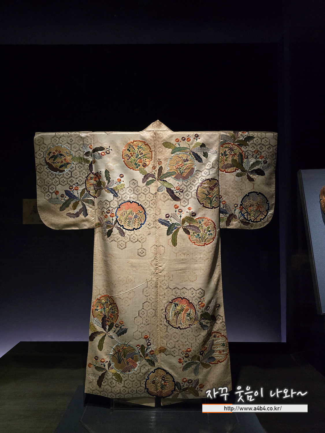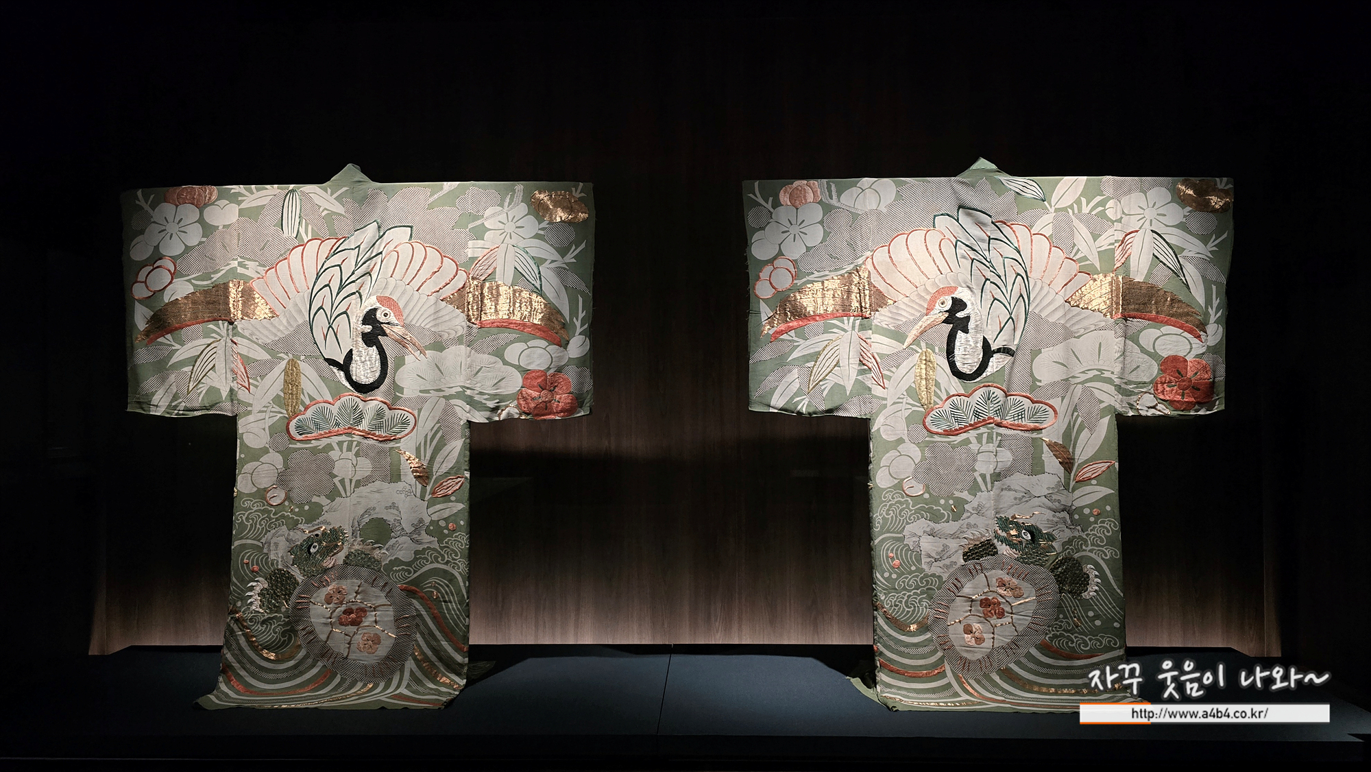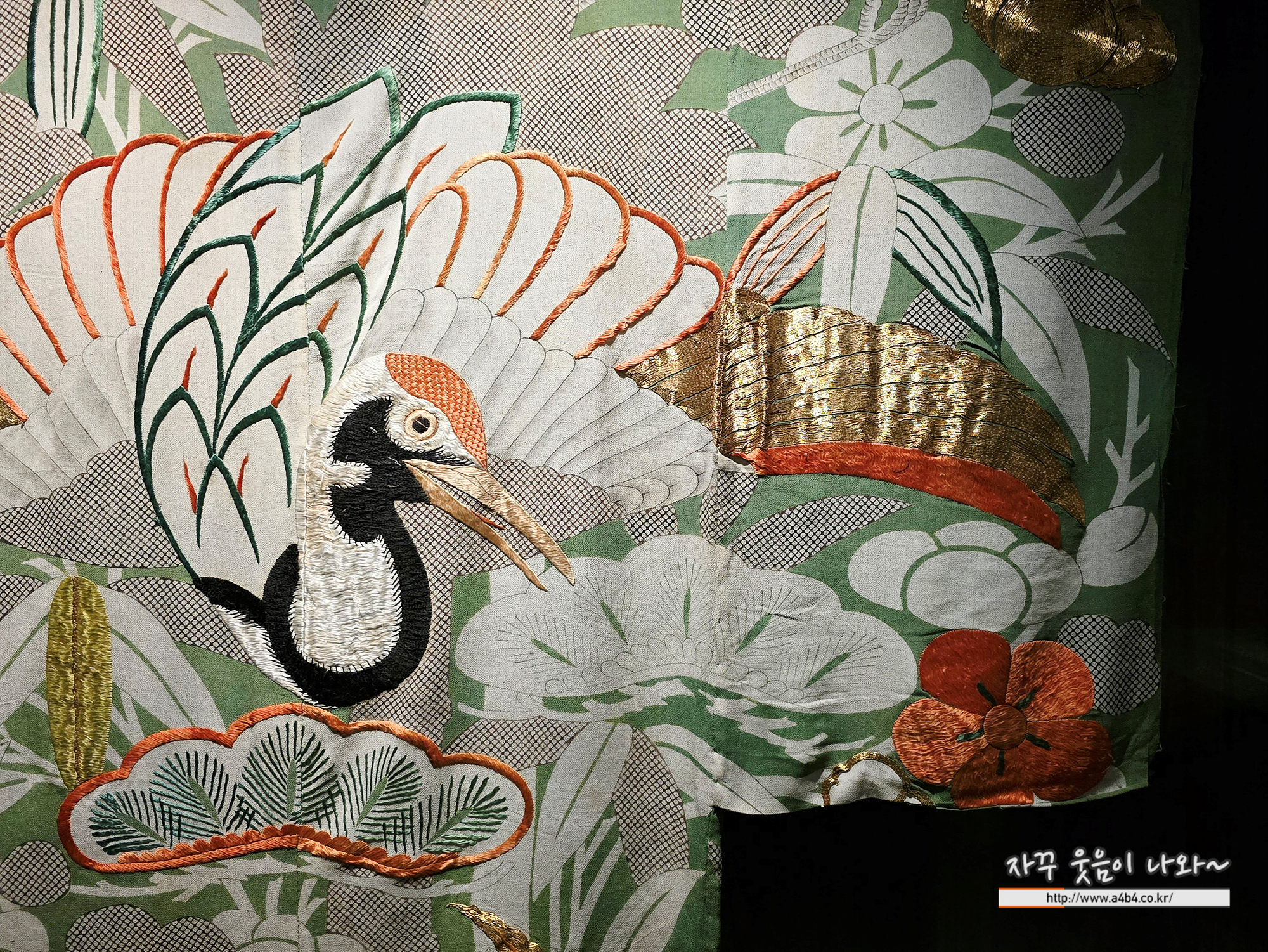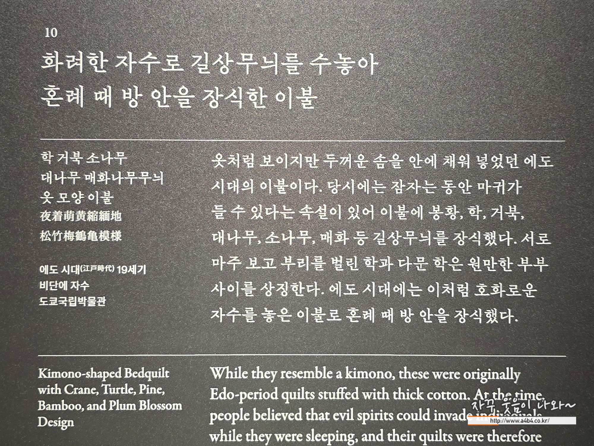 옷처럼 보이는 에도 시대(江戸時代, 1603~1868)의 이불입니다. 원래는 붉은 비단 안감이 있었고, 겉감과 안감 사이에는 두툼한 솜이 들어 있었으나 현재는 해체되어 겉감만 남아 있습니다. 당시 잠자는 동안 마귀가 들 수 있다는 속설이 있었고, 이에 따라 이불에 봉황, 학, 거북, 여의보주, 소나무, 대나무, 매화 등 길상무늬를 자수나 화려한 염색 기법으로 대담하게 표현하였습니다.
