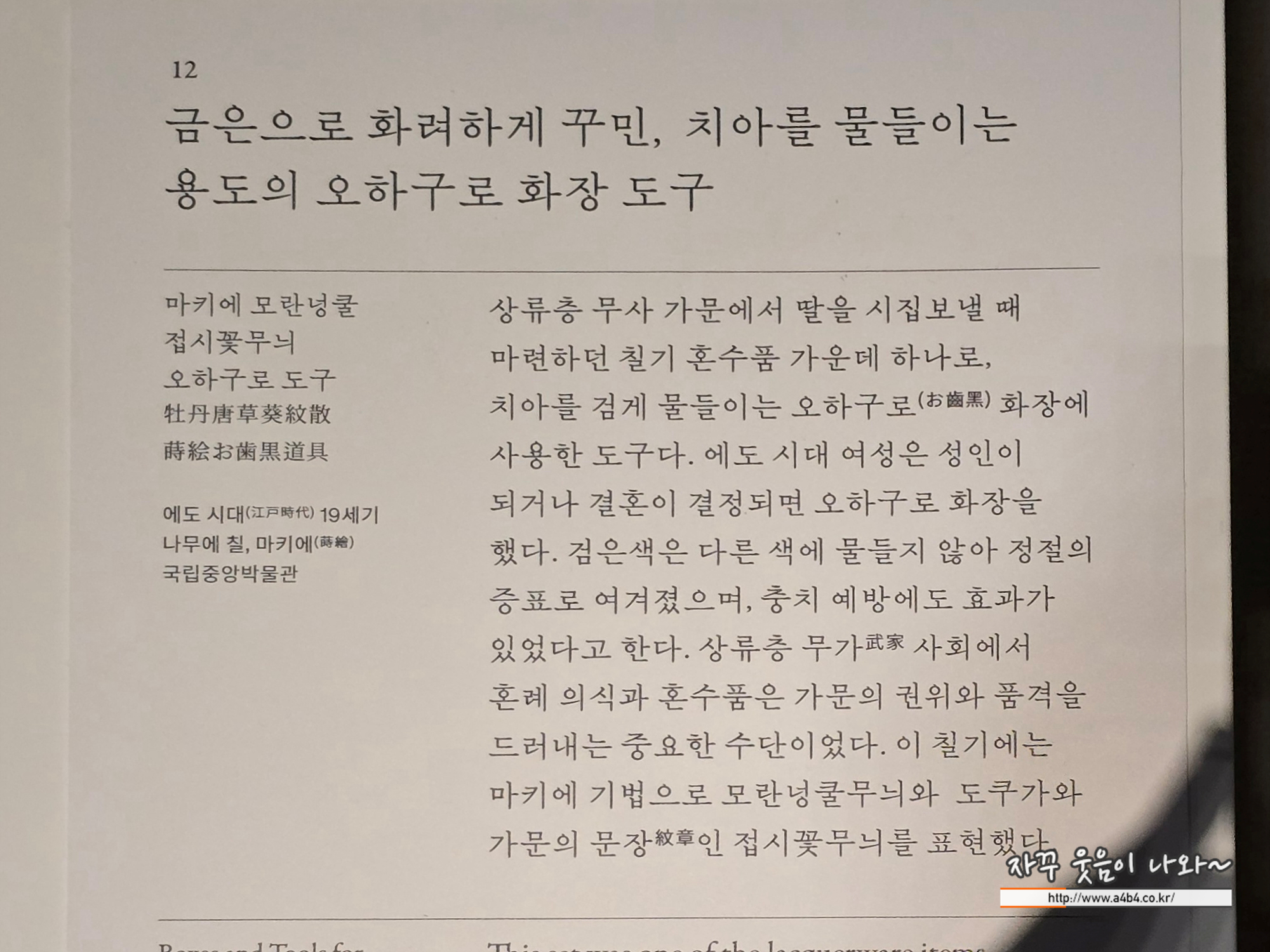 상류층 무사 가문에서 딸을 시집보낼 때 마련하던 칠기 혼수품 가운데 하나로, 치아를 검게 물들이는 데 사용한 도구입니다. 에도 시대(江戶時代, 1603~1868)의 여성은 성인이 되거나 결혼이 결정되면 치아를 검게 물들이는 오하구로(お歯黒) 화장을 했습니다. 검은색은 다른 색에 물들지 않아 정절의 증표로 여겨졌으며, 충치 예방에도 효과가 있었다고 합니다.