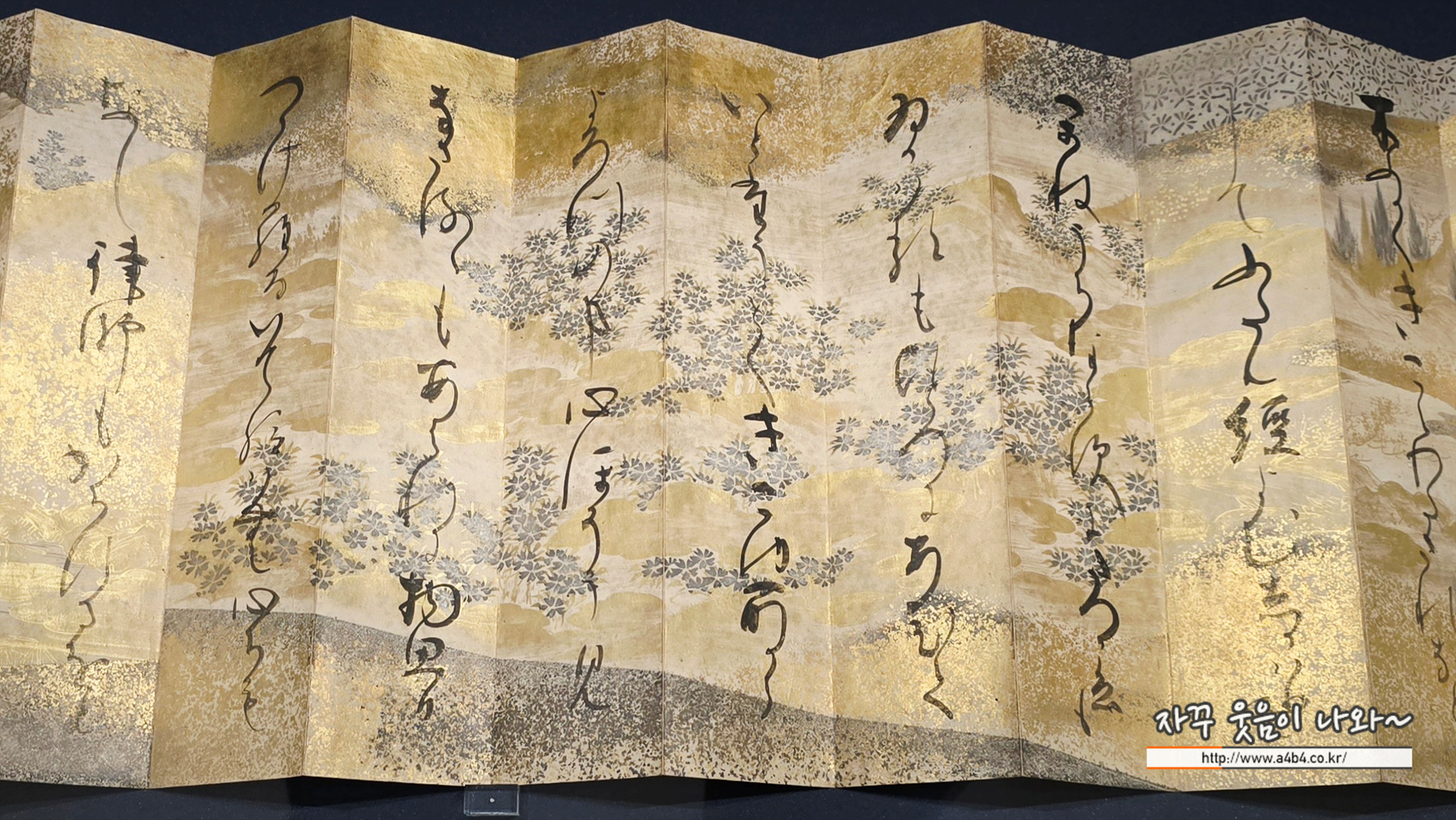 우아한 귀족 문화가 꽃핀 헤이안 시대 이후에는 종이를 갖가지 색으로 물들이고 금과 은으로 그림을 그려 장식하는 문화가 발달했습니다. 이렇게 꾸민 종이에 글씨를 쓸 때는 굳이 빈 공간이 아닌 그림 위에도 겹쳐지도록 썼습니다. 즉 글씨는 단순히 문자의 기능을 넘어 종이 위에서 그림과 어우러져 하나의 아름다움을 자아냈습니다.