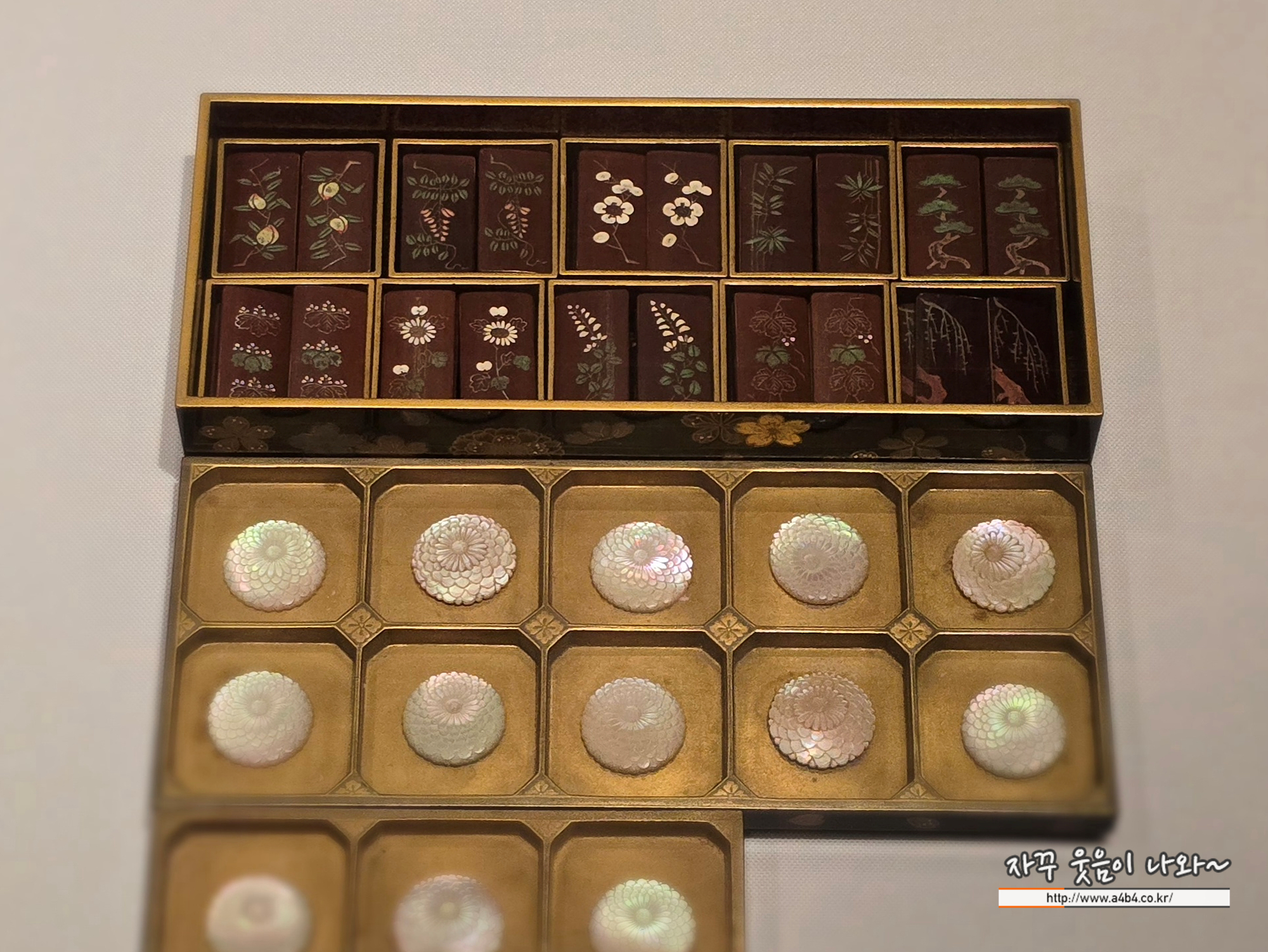 이 작품은 짓큐코에 사용한 도구를 담는 상자이다. 겉 상자를 비롯한 각종 도구 표면은 전체적으로 검은 칠을 하고, 금은 가루와 붉은 가루를 활용한 마키에(蒔繪) 기법으로 벚꽃무늬를 정교하게 장식했다. 또한 뚜껑 안쪽에는 은을 소량한, 흑칠하여 장식의 변화를 주었다. 다양한 꽃무늬와 풍부한 색채가 어우러져 우아하고 화려한 장식을 이루고 있다. 내용물은 향을 담는 도구(향로, 향봉 등을 담는 3단 상자, 제출할 때 담는 통)와 향을 맡을 때 제출할 때 사용하는 도구(향포, 향봉 등을 표시한 패, 제출할 패를 담는 종이 주머니와 통 등)로 구성되어 있다. 후쿠시마 오사무(福島修).