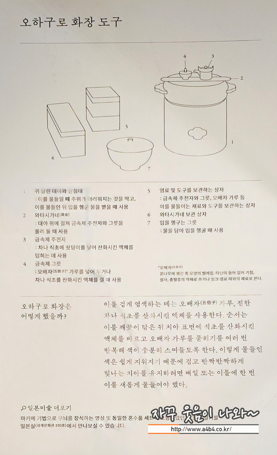 치아를 물들이기 전에는 먼저 뚜껑에 망을 댄 작은 상자에 담긴 양치 도구로 이를 깨끗이 닦고, 뚜껑이 있는 우묵한 그릇을 사용해 입을 헹궜습니다. 본격적으로 이를 물들일 때는 양옆에 귀가 달린 대야 위에 와타시가네(渡金)라는 긴 금속판을 걸쳐두었습니다. 그 위에 치아를 물들이는 염료와 용액이 담긴 금속제 주전자·그릇을 올리고, 새 깃털로 만든 붓으로 치아를 염색했습니다. 귀 달린 대야 안에는 끓인 물을 넣어 염색을 마친 뒤 입을 헹궜습니다..