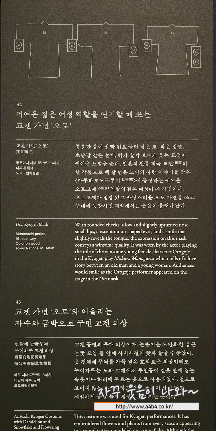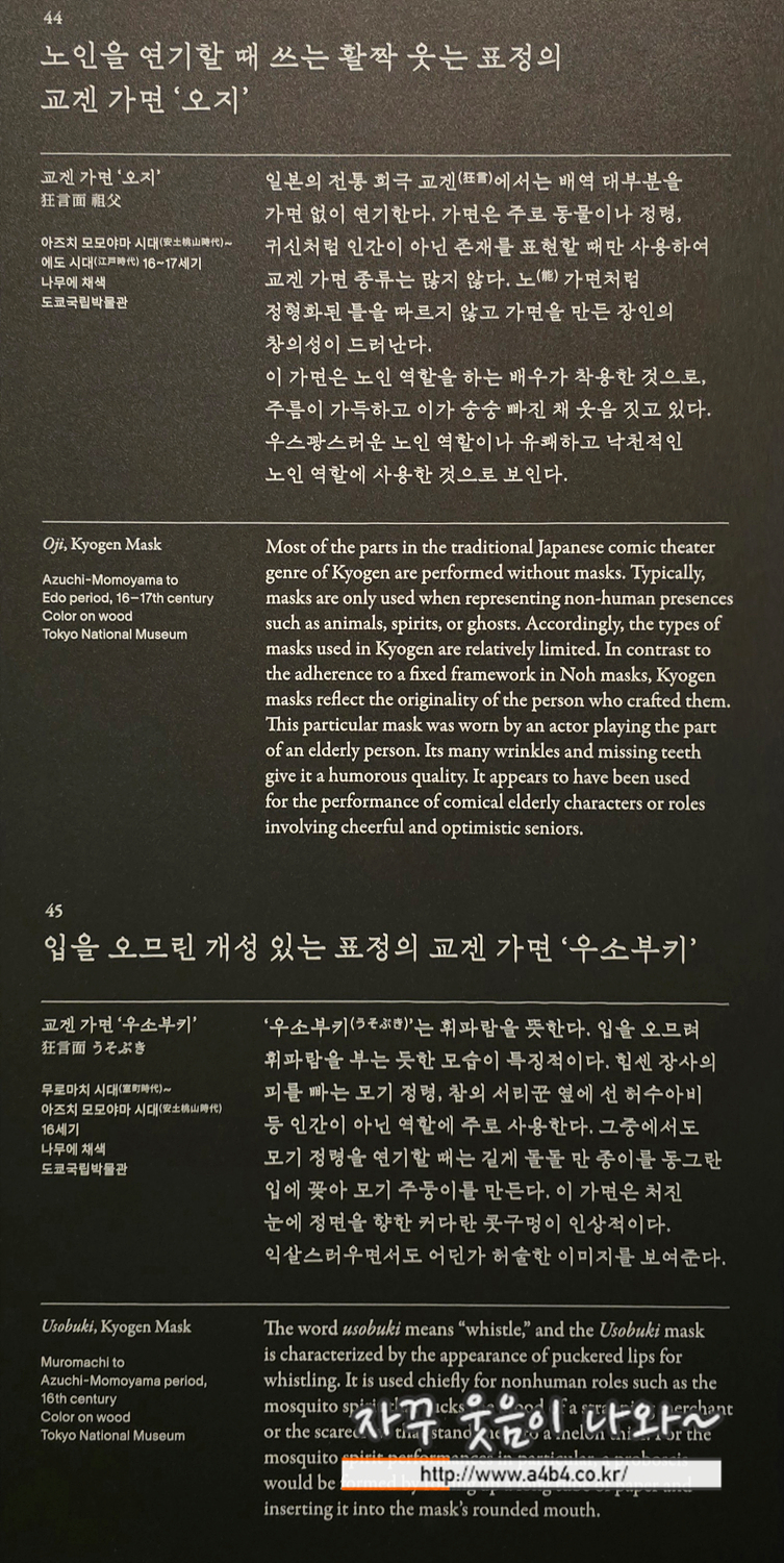 비극적인 노의 막간에는 희극인 교겐(狂言)을 상연하였습니다. 노의 체계를 확립한 제아미(世阿弥, 1363년경~1444년경)께서는 노 공연 세 편과 교겐 공연 두 편을 번갈아 올린다고 기록하셨습니다. 대사 중심으로 진행되는 교겐은 일상적인 유쾌하고 재미있는 이야기를 다루며, 교겐 가면은 개성 있는 생김새와 익살스러운 표정으로 배역의 성격을 단번에 드러냅니다. 배우는 과장된 몸짓과 대사로 관객 여러분께 웃음을 전해 드렸습니다. 이처럼 엄숙한 노의 막간에 등장한 교겐은 일본 미술 속에서 슬픔과 유쾌함이 공존하는 모습을 보여 줍니다.
