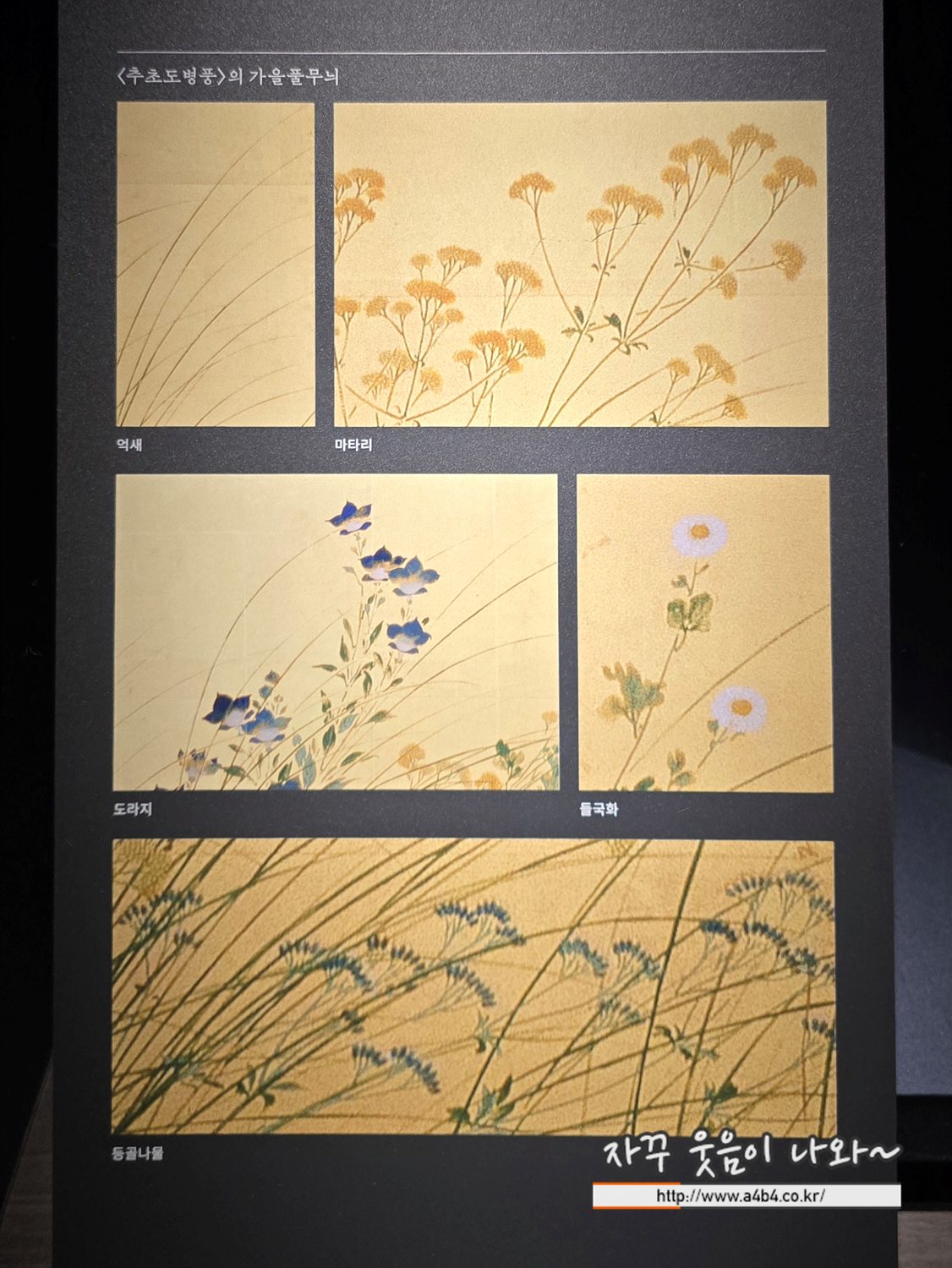 각 병풍에는 흰 점 위에 노란색을 덧칠하여 입체적으로 표현한 마타리꽃과 푸른빛 도라지꽃이 풍성하게 피어 있습니다. 마타리와 도라지는 ‘가을의 일곱 가지 풀’에 속하며, 이는 일본에서 가장 오래된 시가집 『만요슈(萬葉集)』에 수록된 “싸리꽃, 억새꽃, 칡꽃, 패랭이꽃, 마타리꽃, 등골나물, 도라지꽃[萩の花 尾花 葛花 なでしこの花 女郎花 藤袴 朝がほの花]”이라는 시 구절에서 유래했습니다. 가을에 잠시 피었다 지는 풀꽃은 지나감을 향한 아쉬움과 애틋함을 담고 있습니다. 이처럼 가을풀은 일본에서 그림의 소재로 널리 사랑받았습니다.