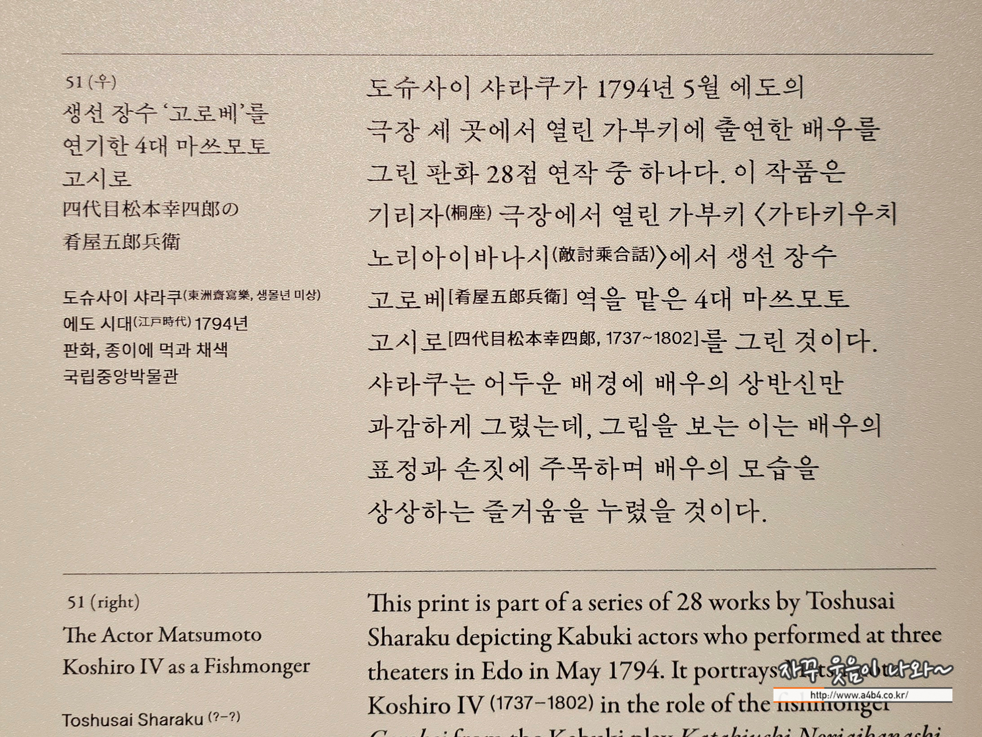 화면 왼쪽에는 도슈사이 샤라쿠의 이름과 함께, 그와 협업하여 판화 연작을 출판한 쓰타야 주자부로(蔦屋重三郎, 17501797)의 인장과 막부 검열을 통과했음을 증명하는 기아메(極印)가 찍혀 있습니다.