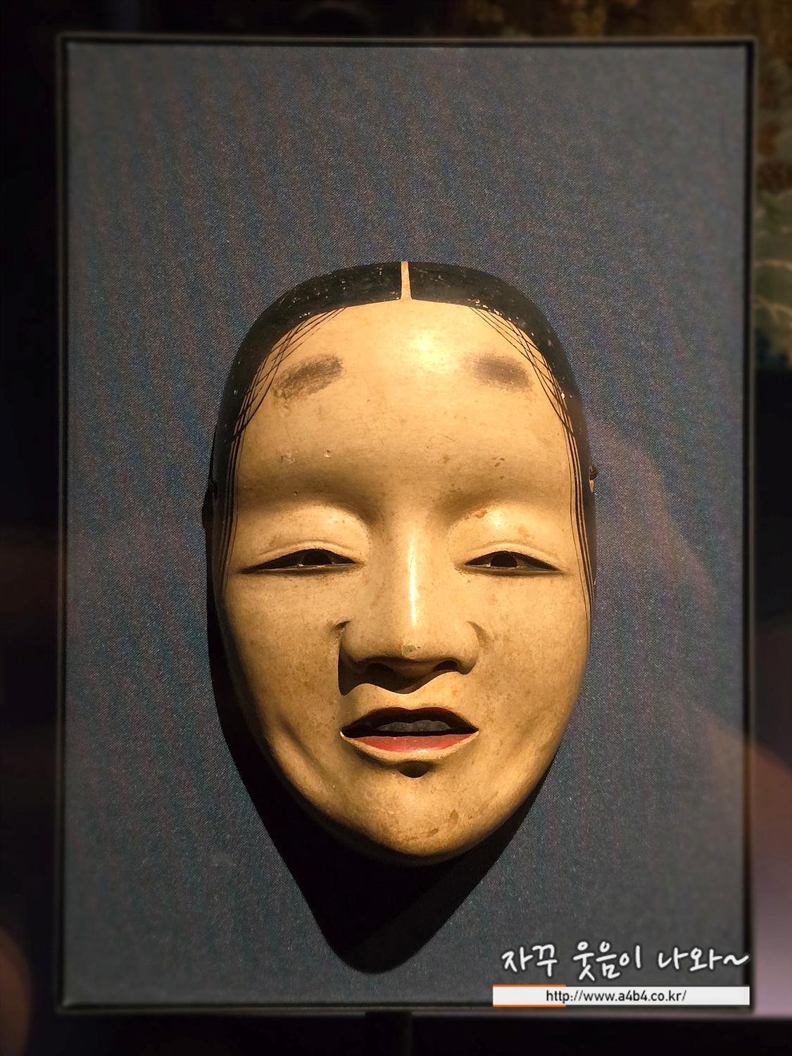정감 있고 사랑스러운 인상의 가면입니다. 통통한 볼에 살짝 위로 들린 낮은 코, 단정한 머리, 작은 입술, 초승달 같은 눈매, 혀가 살짝 보이게 웃는 표정이 귀여운 느낌을 줍니다. 이러한 모습은 일본의 전통 희극 ‘교겐(狂言)’의 작품 <마쿠라노노구루이(枕物狂)>에 등장하는 ‘오토고제(乙御前)’ 역할에 어울리는 가면입니다.