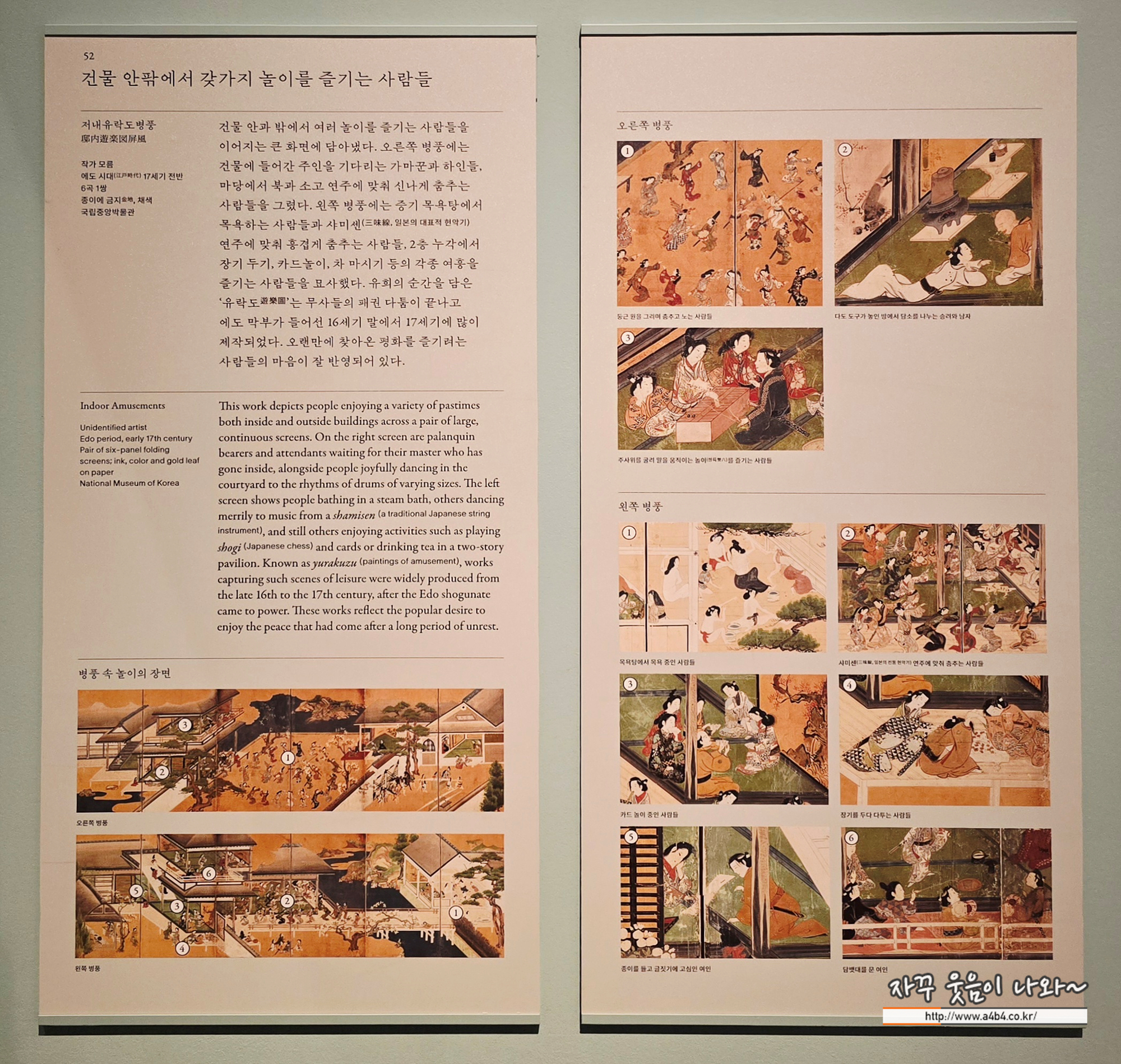왼쪽 병풍에는 증기 목욕탕에서 목욕하는 사람들과 샤미센(三味線, 일본의 대표적인 현악기) 연주에 맞추어 신나게 춤을 추는 사람들, 그리고 2층 누각에서 장기를 두고 편지를 쓰며 카드놀이와 차 마시기 등 여흥을 즐기는 이들의 모습이 묘사되어 있습니다.